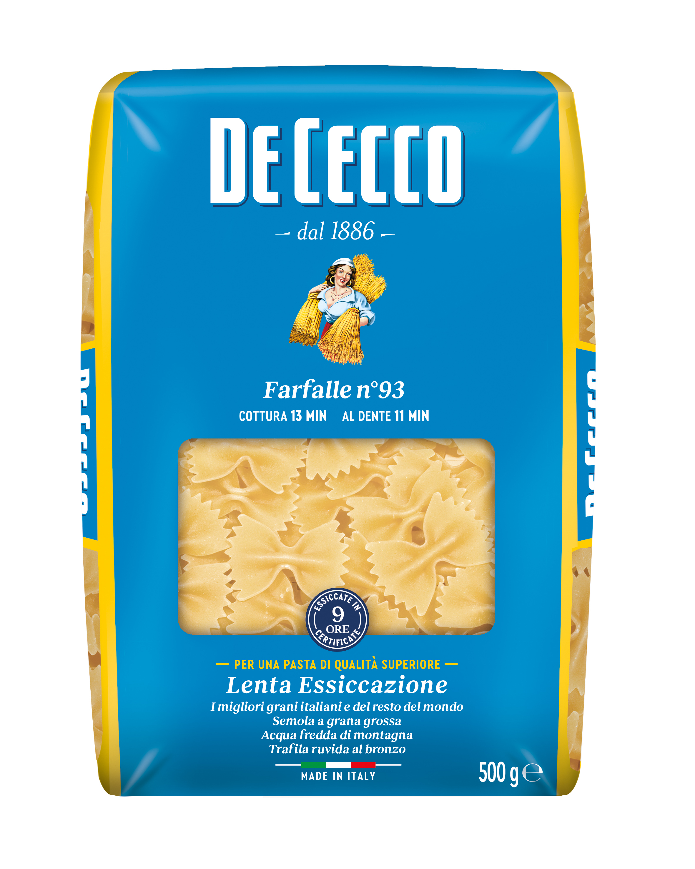 Описание: Макароны DE CECCO Фарфалле (Farfalle) в форме бабочек оптимально подойдут в качестве гарнира к мясу, ингредиента для теплого итальянского салата с овощами или куриного супа. Продукт создан из пшеницы твердых сортов и очищенной воды с соблюдением традиционной рецептуры, что обеспечивает выраженный приятный вкус блюда, а также насыщенность полезными микроэлементами. Сложные углеводы и растительная клетчатка усваиваются организмом в течение нескольких часов, способствуя длительному сохранению чувства сытости.Макароны просты в приготовлении, которое займет не более 13 минут в кипящей подсоленной воде. Фарфалле хорошо сочетаются с оливковым маслом, соусами из сливок или морепродуктов. дeУниверсальный гарнир, как спагетти, лапша, вермишель, Wok, фунчоза, рис, гречка, картофель, булгур, чечевица, клецки. Итальянская паста подходит к сливочному соусу, томатному соусу, соусу песто. Гарнир сочетается с рыбными и мясными блюдами. Идеальное блюдо на обед и ужин. Продукты для дома, для ресторана