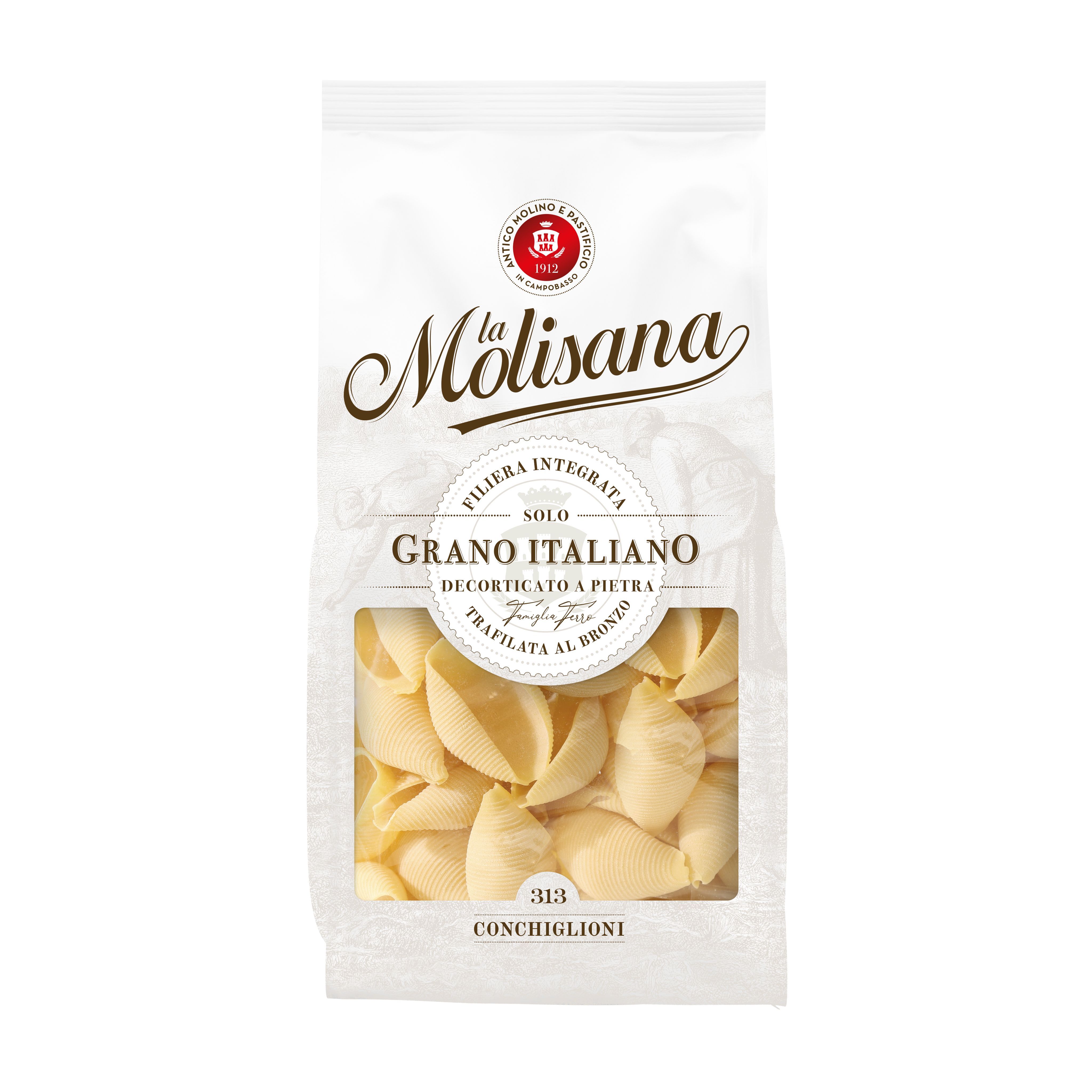 Итальянские макароны La Molisana Conchiglioni №313 500 г — высококачественная продукция с натуральным составом, в котором нет ничего, кроме чистейшей артезианской воды из горного источника и муки из пшеницы твердых сортов. Большие рельефные ракушки с шероховатой поверхностью, изготовленные при помощи бронзовой формы, принято фаршировать сыром, измельченным филе морепродуктов, мясным фаршем и т. п. Они хорошо сочетаются с оливковым маслом и душистыми травами. Она хорошо поглощает воду, макароны из нее при варке увеличиваются и не развариваются.