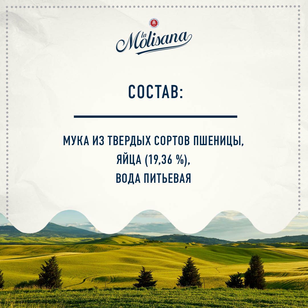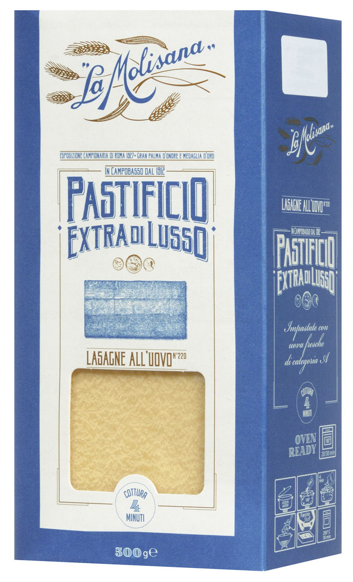 Для производства лазаньи La Molisana используются исключительно натуральные продукты — пшеничная мука из твердых сортов, очищенная питьевая вода, а также наличие незначительного количества яичного желтка. Итальянские макароны обладают стандартной прямоугольной формой, которая достигается за счет эффективного раскатывания пористого теста. Для приготовления необходимо отварить лазанью 4 минуты, выложить их на ровную поверхность, смазать соусом бешамель или болоньезе, после чего поставить в духовой шкаф на 20 минут. Вкусовые качества лазаньи торговой марки La Molisana оптимально раскрываются в готовом блюде и подчеркивают остальные ингредиенты.