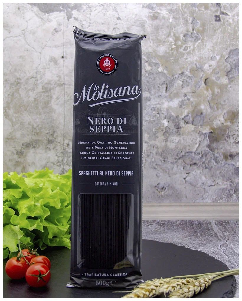 Описание: Спагетти с чернилами каракатицы La Molisana Spaghetti Al Nero Di Seppia сделаны из муки твердых сортов, содержащей чуть меньшее количество клейковины, чем обыкновенная мука. Она хорошо поглощает воду, макароны из нее при варке увеличиваются и не развариваются.