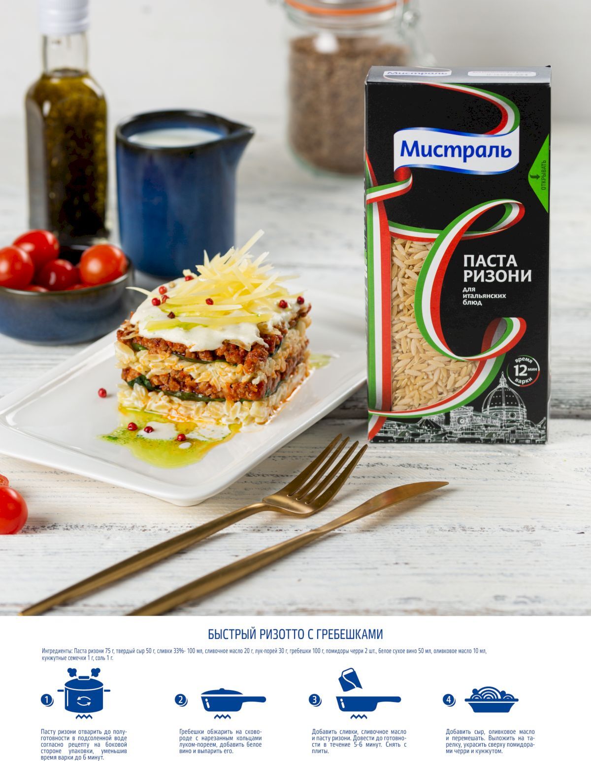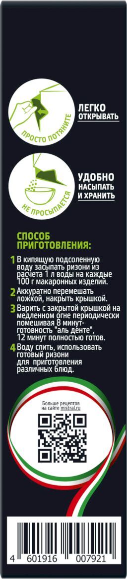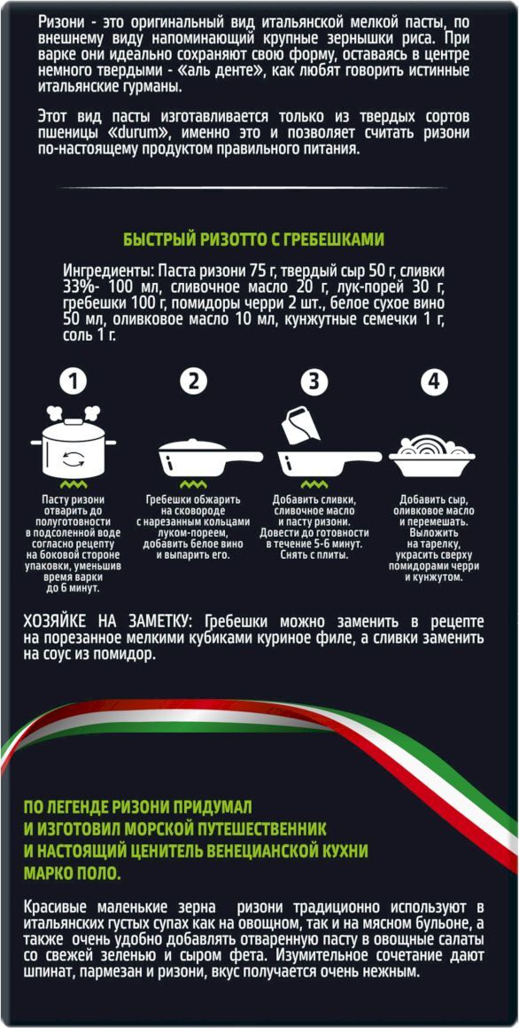 Описание: Ризони — это оригинальный вид итальянской мелкой пасты, по внешнему виду напоминающий крупные зернышки риса. При варке они идеально сохраняют свою форму, оставаясь в центре немного твердыми — «аль денте», как любят говорить истинные итальянские гурманы. Красивые маленькие зерна ризони традиционно используют в итальянских густых супах как на овощном, так и на мясном бульоне, а так же очень удобно добавлять отваренную пасту в овощные салаты со свежей зеленью и сыром фета.