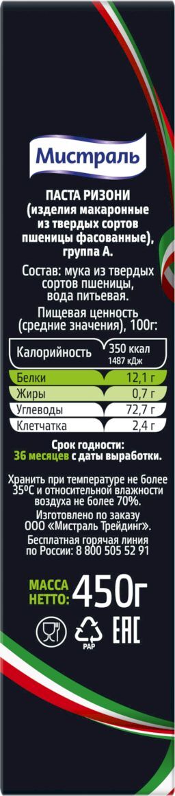 Макаронные изделия Мистраль Паста Ризони, 450 г