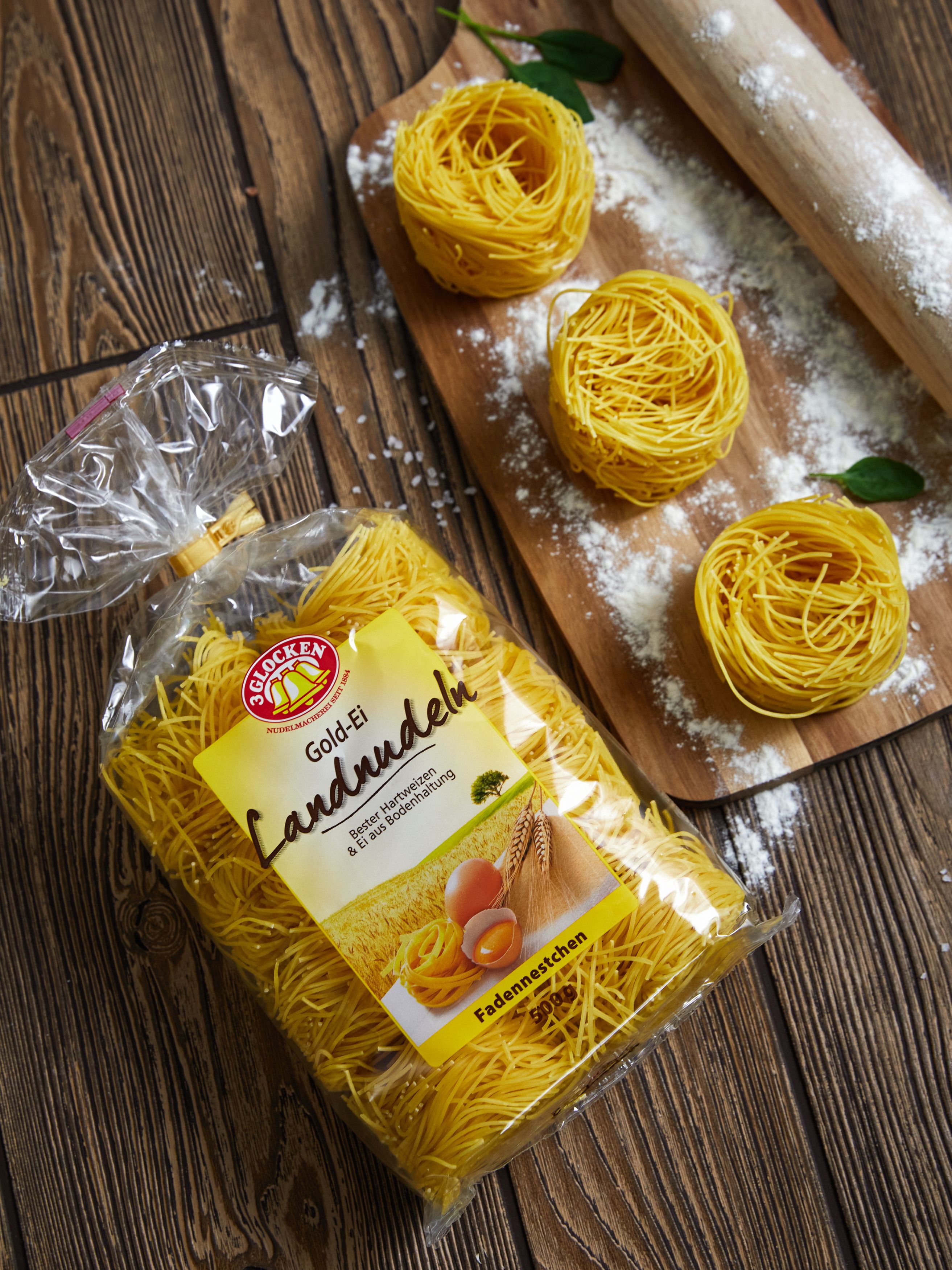 3 Glocken Fadennestchen содержат четыре яйца на один килограмм муки. Изысканная упаковка с бантиком и домашняя рецептура делают эту серию особенно привлекательной. Условия хранения: в сухом прохладном месте при температуре до 30°C и относительной влажности воздуха не более 70%