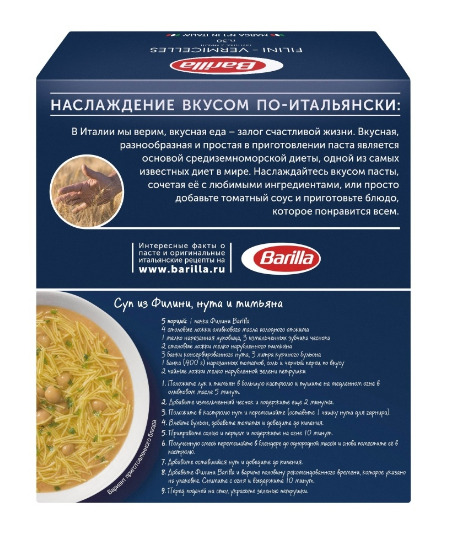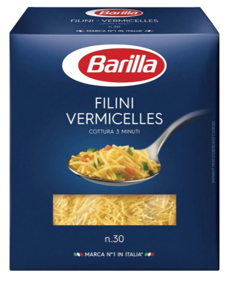 Описание: Макароны Barilla Filini Vermicelles № 30 порадуют поклонников легкой пасты. Сделанная в форме тонких коротких нитей, она прекрасно подходит для супов. За счет своего размера, филини очень быстро готовятся и превосходно держат форму после варки. Она отлично сочетается с мясным, куриным, рыбным бульоном и делает его более ароматным и сытным. В составе макарон только два ингредиента: мука из твёрдых сортов пшеницы и вода, благодаря чему они не развариваются и не слипаются. Для приготовления пасты Barilla Филини понадобится всего 3 минуты, поэтому рекомендуется добавлять её в суп уже на финальном этапе. В процессе варки вермишель сохраняет форму и аппетитный вид.
