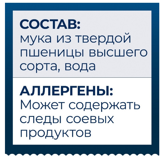 Вода питьевая 10%, пшеничная мука твердых сортов 90%. Может содержать следы соевых продуктов.