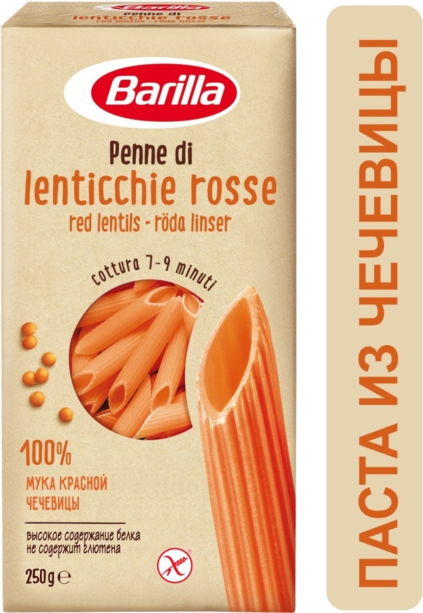 Описание: Макароны Barilla Penne Red Lentil – необычная разновидность традиционной итальянской пасты. В её составе только мука из перемолотой красной чечевицы и вода, поэтому она содержит в себе всю пользу бобовых культур. Бобы – это пищевая электростанция, насыщенная белком, пищевыми волокнами, витаминами и полезными микроэлементами. Без глютена, без красителей и пищевых добавок. Эта паста идеально вписывается в рацион потребителей, предпочитающих здоровый образ жизни. Чечевичные макароны прекрасно сочетаются с мясом, птицей, рыбой и различными овощами, а также практически с любыми соусами. Они открывают неограниченный простор для полёта вашей кулинарной мысли. Готовить макароны-перья рекомендуется в течение 7-9 минут. Благодаря натуральному составу и использованию высококачественной чечевичной муки паста не разваривается и отлично сохраняет форму