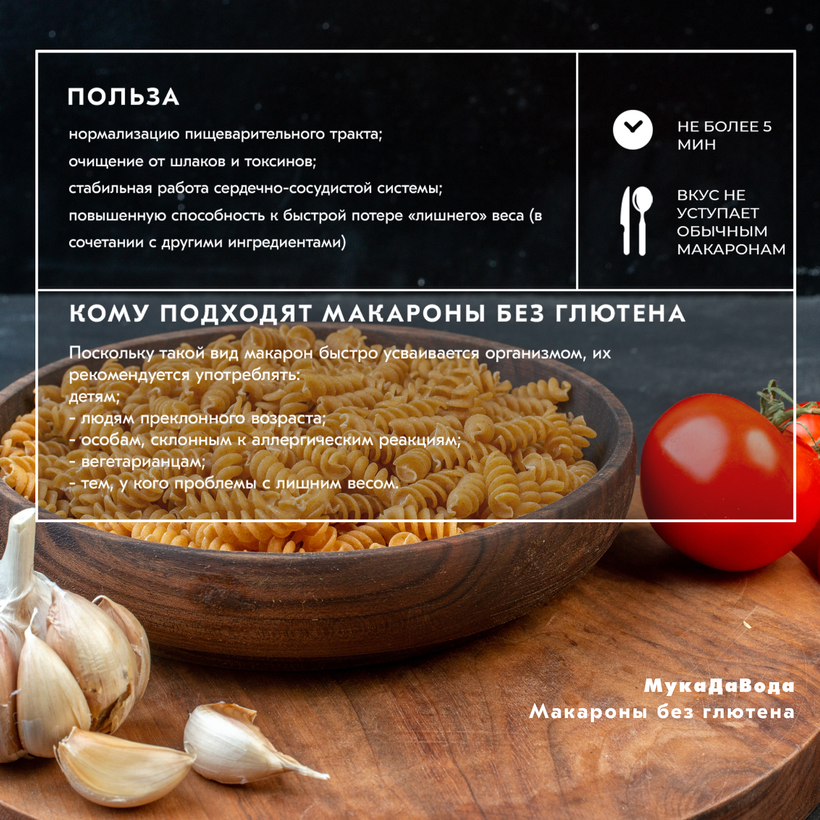 Описание: Макароны без глютенаМукаДаВода Макароны без глютена макароны  МукаДаВода– отличный способ разнообразить диетическое меню, добавив их к привычным макаронам.