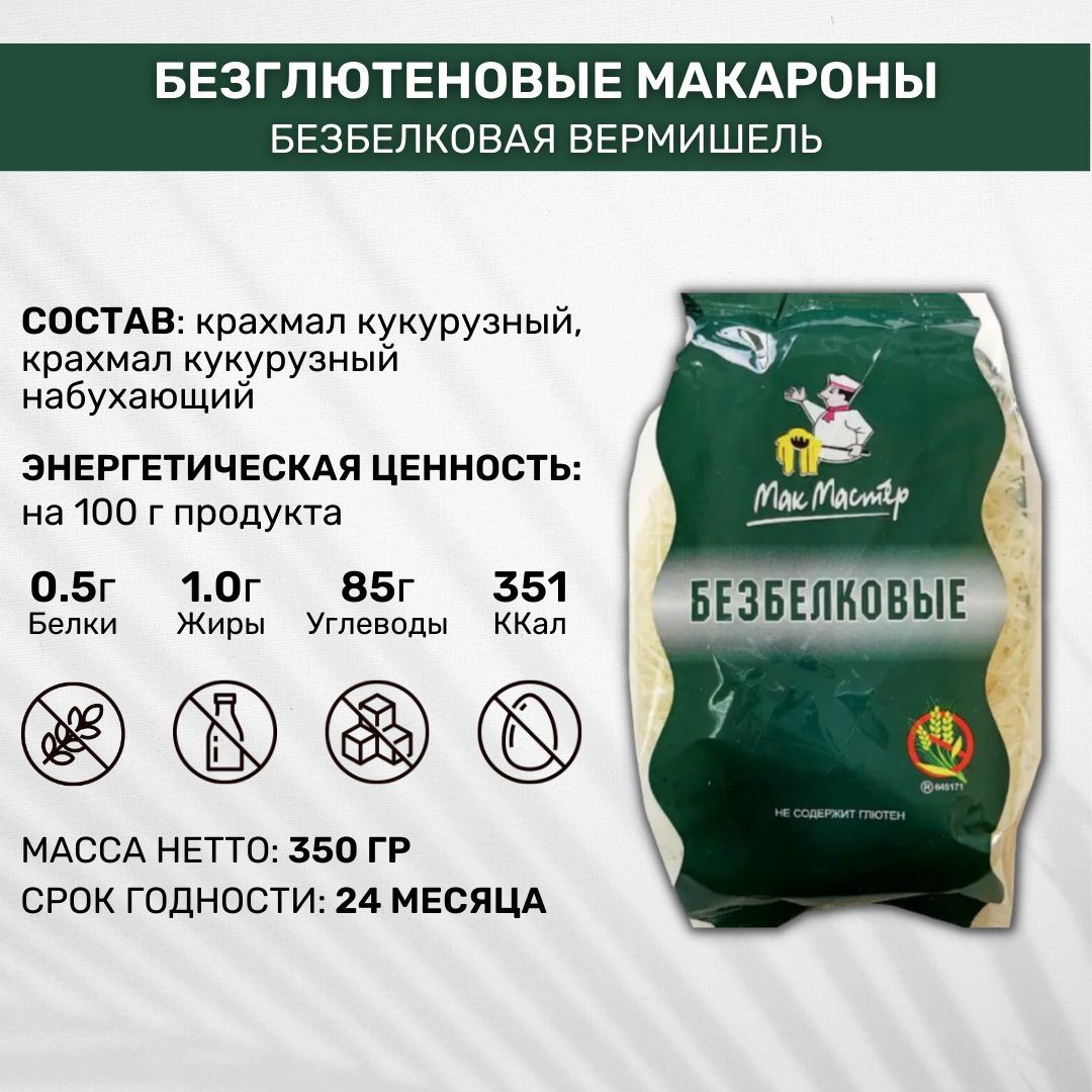 Описание: Безбелковая вермишель МакМастер производится из безбелкового сырья - крахмала. Ведётся жёсткий контроль содержания белка в сырье и готовой продукции ГОСТовскими методами высококвалифицированными специалистами. Содержание белка в макаронах не превышает 0,9%.