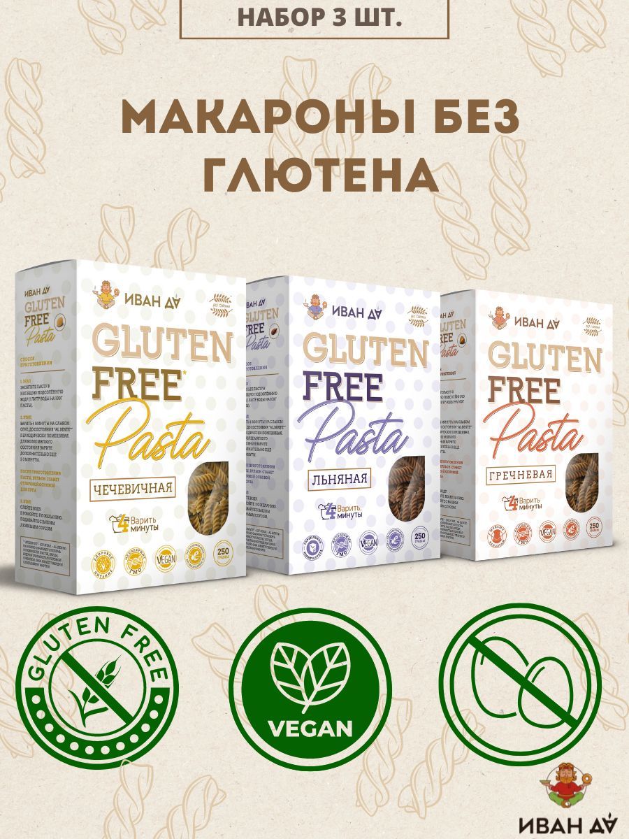 Описание: Набор 3 упаковки по 250г. макароны без глютена: льняные, гречневые, чечевичные. Гречневые макароны содержат много белка и витаминов группы B. Это прекрасный источник энергии на весь день. Любители гречки точно оценят их вкус и знакомый аромат! Безглютеновая паста льняная делается из льняной муки, которая получается из семян, прошедших отжим масла, поэтому содержание жиров в ней не так велико. Тем, кто стремится похудеть, это на руку: продукт так же, как семена, выводит из организма лишнюю влагу и токсины, питает микробиом кишечника благодаря пищевым волокнам, содержит омега-3 и омега-6 жирные кислоты, но менее калориен. Вкус муки тоже отличается от масла и семечек, он гораздо более нежный и ненавязчивый! Паста из муки чечевицы зеленой (без глютена).Результат совместного труда нашей компании и Кемеровского технологического института пищевой промышленности. Мы отрабатывали рецептуру в течение 18 месяцев, чтобы достичь идеального вкуса, который бы нам понравился. Безглютеновая диета или просто диета не повод отказываться от любимой пасты! Теперь мы точно это знаем. Готовьте свои любимые соусы и пробуйте вкуснейшие рецепты, которые мы оставили для Вас на упаковке. Наши безглютеновые макароны не развариваются, сохраняют форму и отлично впитывают соусы.