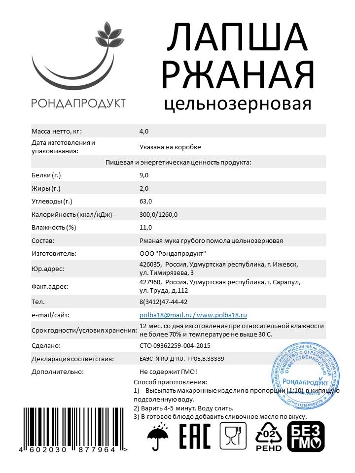 Макароны цельнозерновые лапша ржаная 4 000 г, диетические продукты питания, Рондапродукт