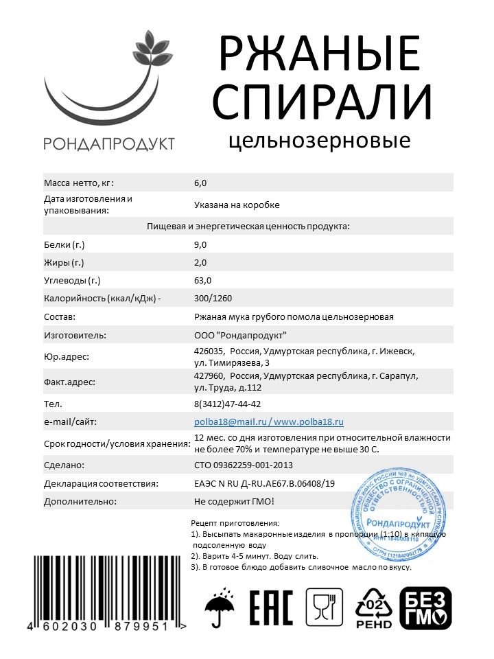 Описание: Макароны цельнозерновые Рондапродукт - это замечательное сочетание натуральности, питательности и вкуса в одном продукте. Ржаные спирали богаты ценными волокнами и натуральным вкусом, идеальны для здорового и диетического питания.