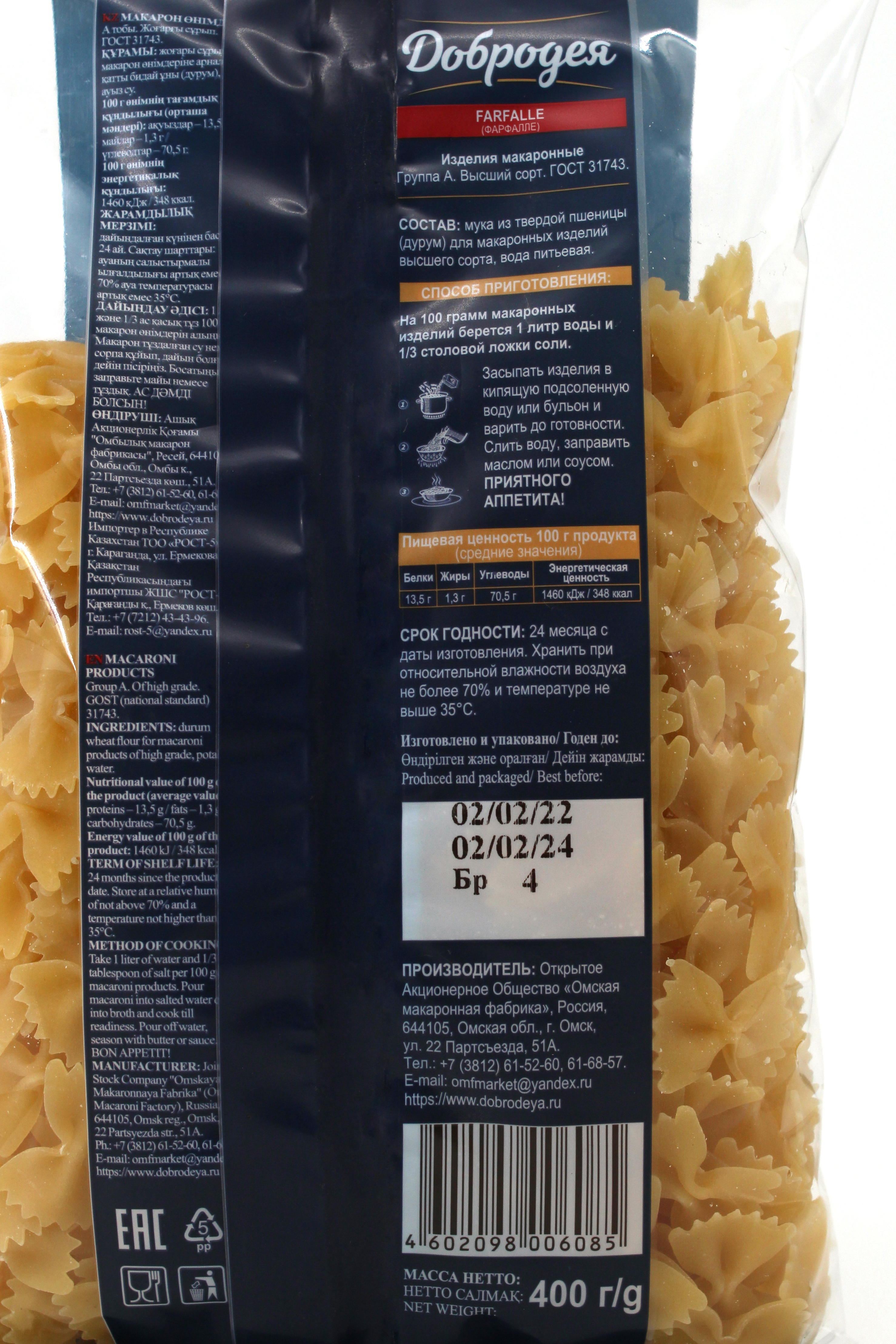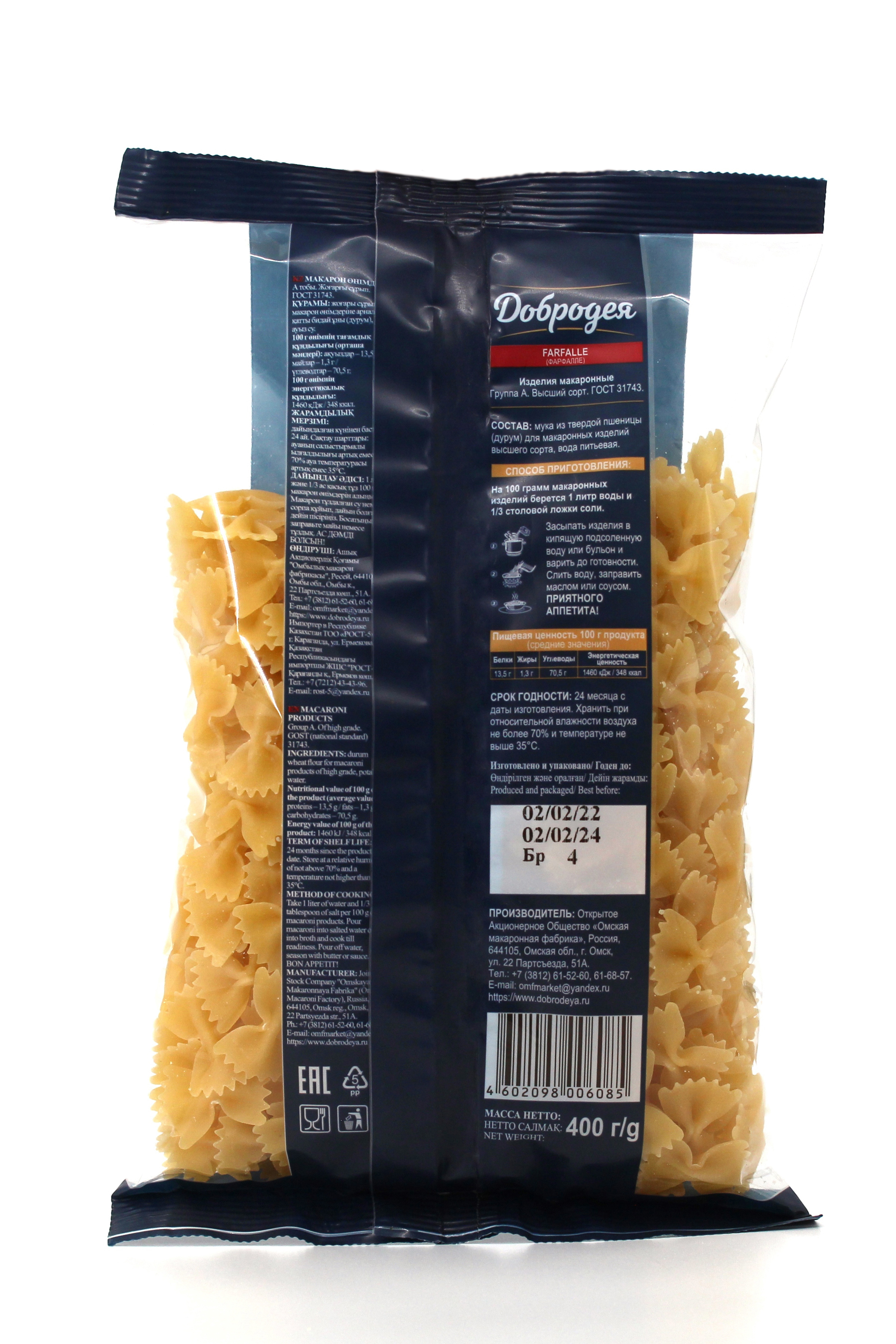 Макароны "ДОБРОДЕЯ" FARFALLE (ФАРФАЛЛЕ) из твердых сортов пшеницы 400 грамм