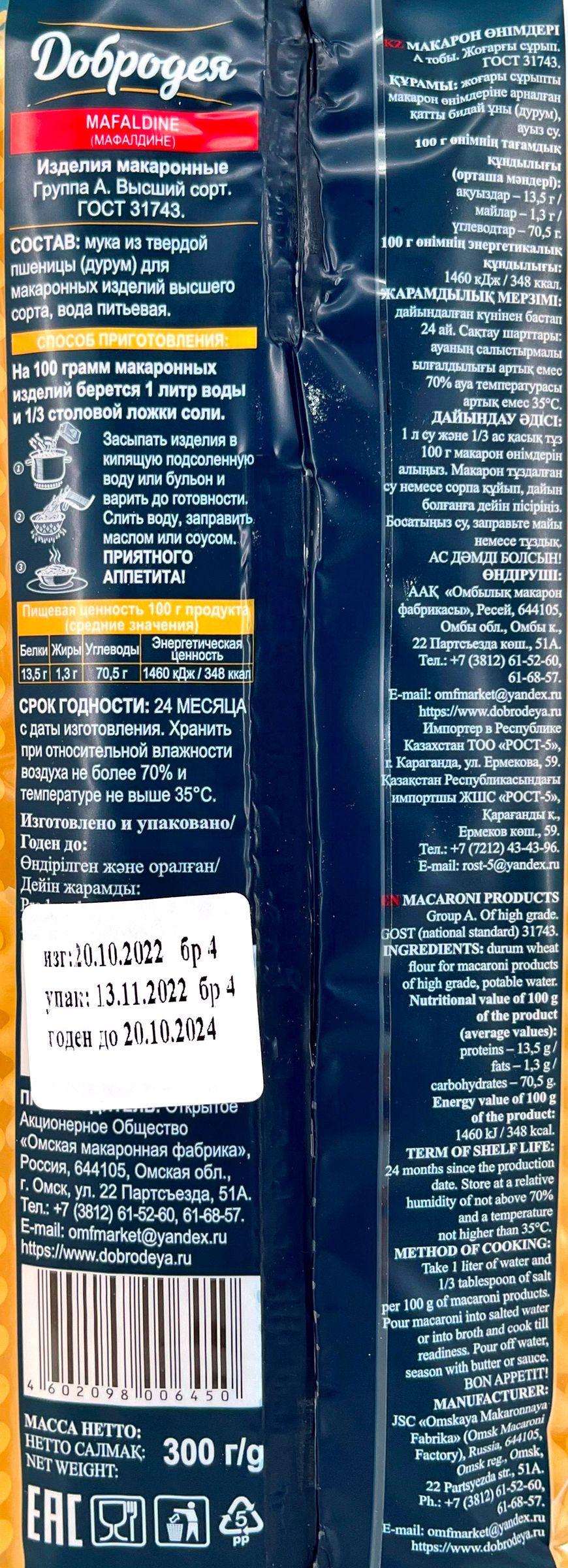 Макароны "ДОБРОДЕЯ" MAFALDINE (МАФАЛДИНЕ) из твердых сортов пшеницы 300 грамм