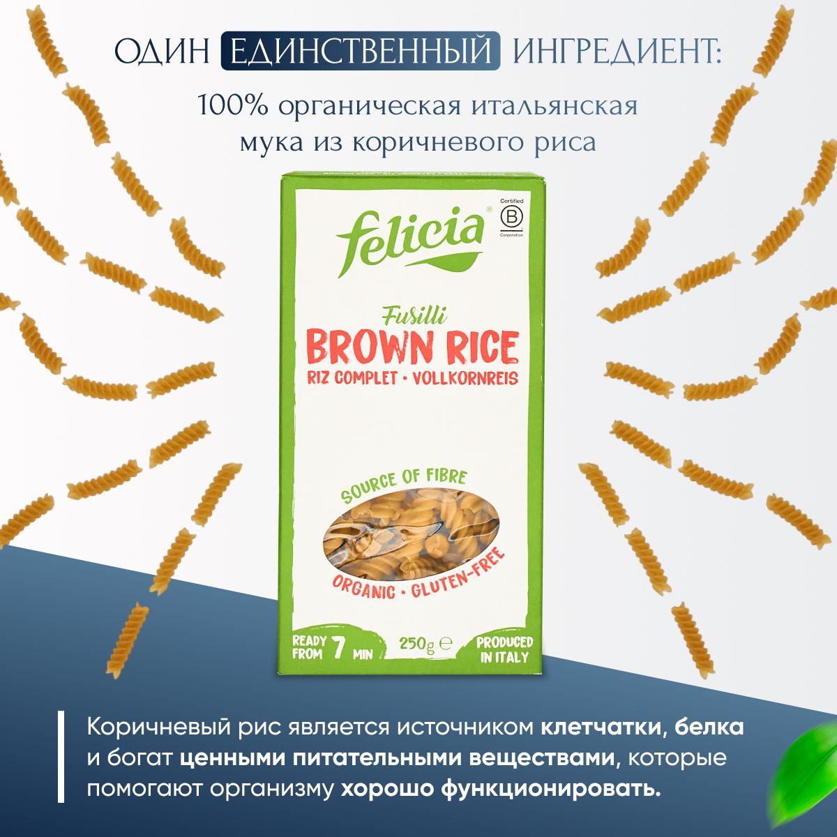 Макароны Felicia из коричневого цельнозернового риса: фузилли, 250 г., Без глютена