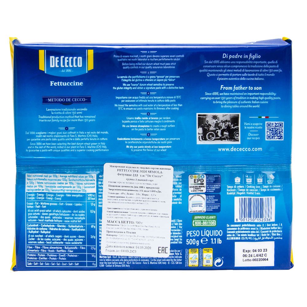 Описание: Макароны Феттучине №233 DeCeccoDe Cecco – ведущая международная итальянская компания по производству высококачественных макаронных изделий и оливкового масла, основанная в 1886 году.
