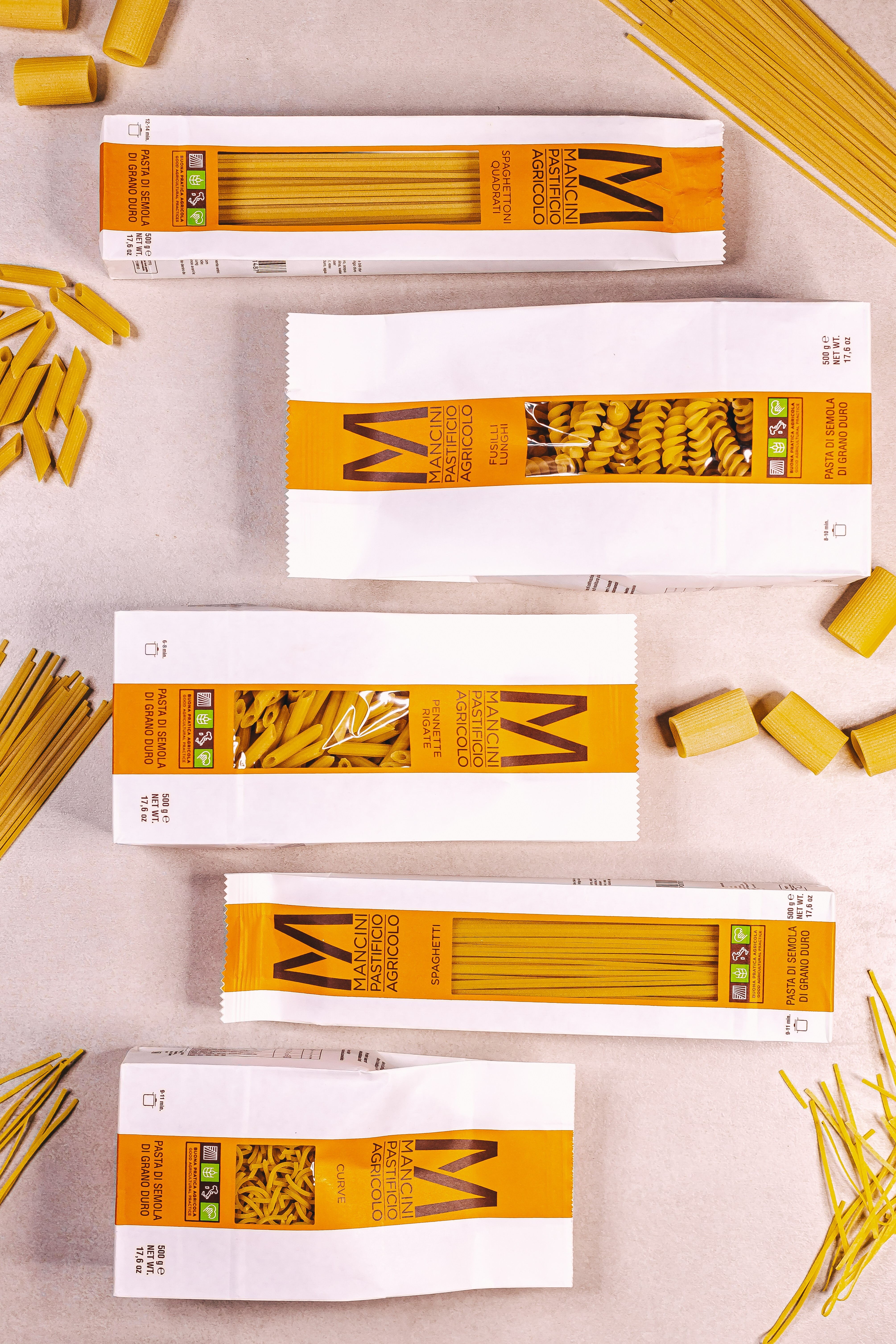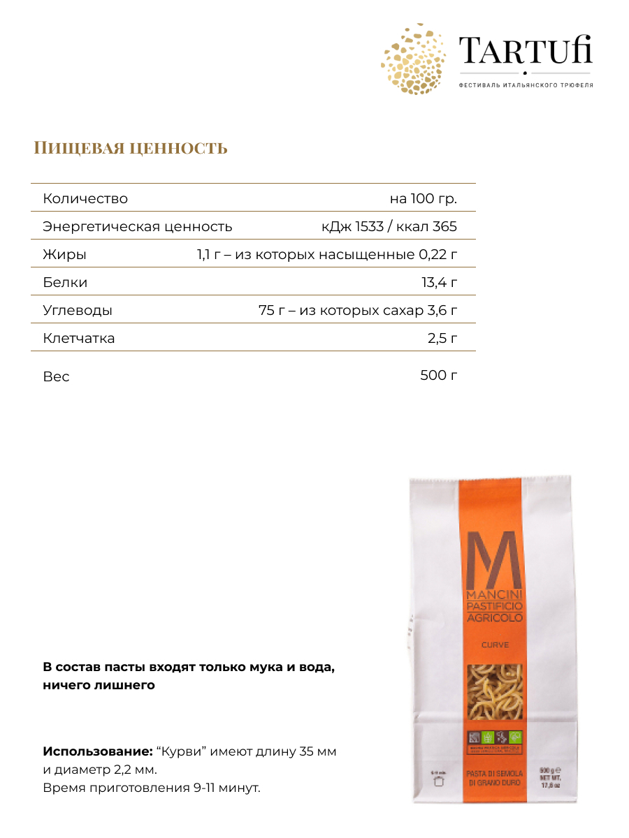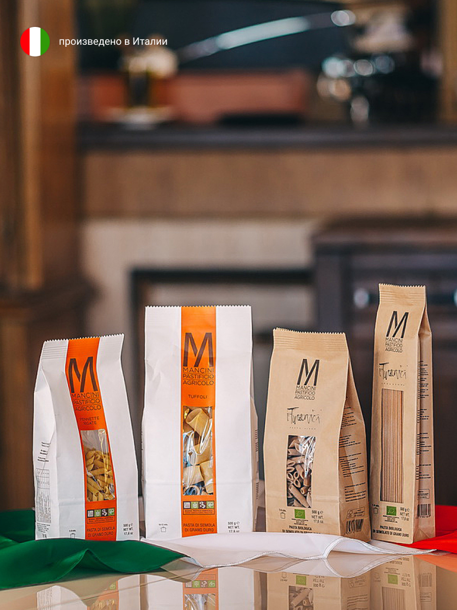 Марка Mancini добилась высочайшего качества в области производства пасты. Малые объемы производства позволяют использовать бронзовые матрицы, придающие поверхности пасты требуемую шероховатость, и проводить сушку готового продукта на низких температурах.⠀Это занимает значительно больше времени, чем процессы массового выпуска, но именно такая технология обеспечивает сохранность глубокого вкуса и пряного аромата настоящей Италии.