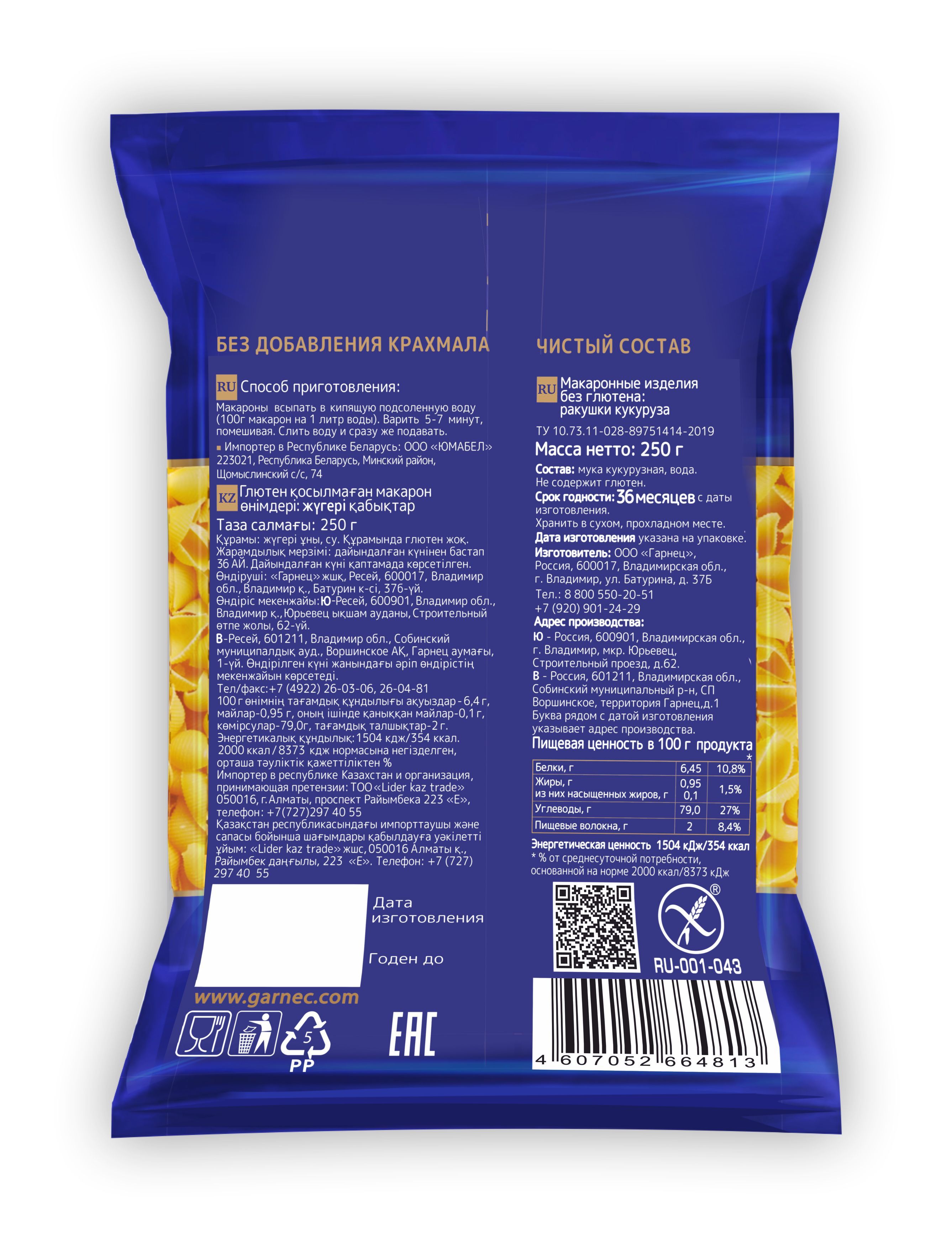 Макароны кукурузные без глютена: ракушки Garnec 4 шт по 250 гр