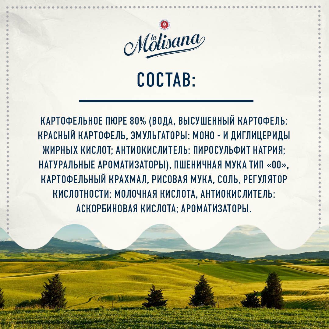 "Картофельное пюре 80% (вода, высушенный картофель: красный картофель, эмульгаторы: моно- и диглицириды жирных кислот, антиокислитель пиросульфит натрия, натуральные ароматизаторы), пшеничная мука тип ""00"", картофельный крахмал, рисовая мука, соль, регулятор кислотности: молочная кислота, антиоксилитель: аскорбиновая кислота; ароматизаторы. Может содержать глютен и сульфиты."