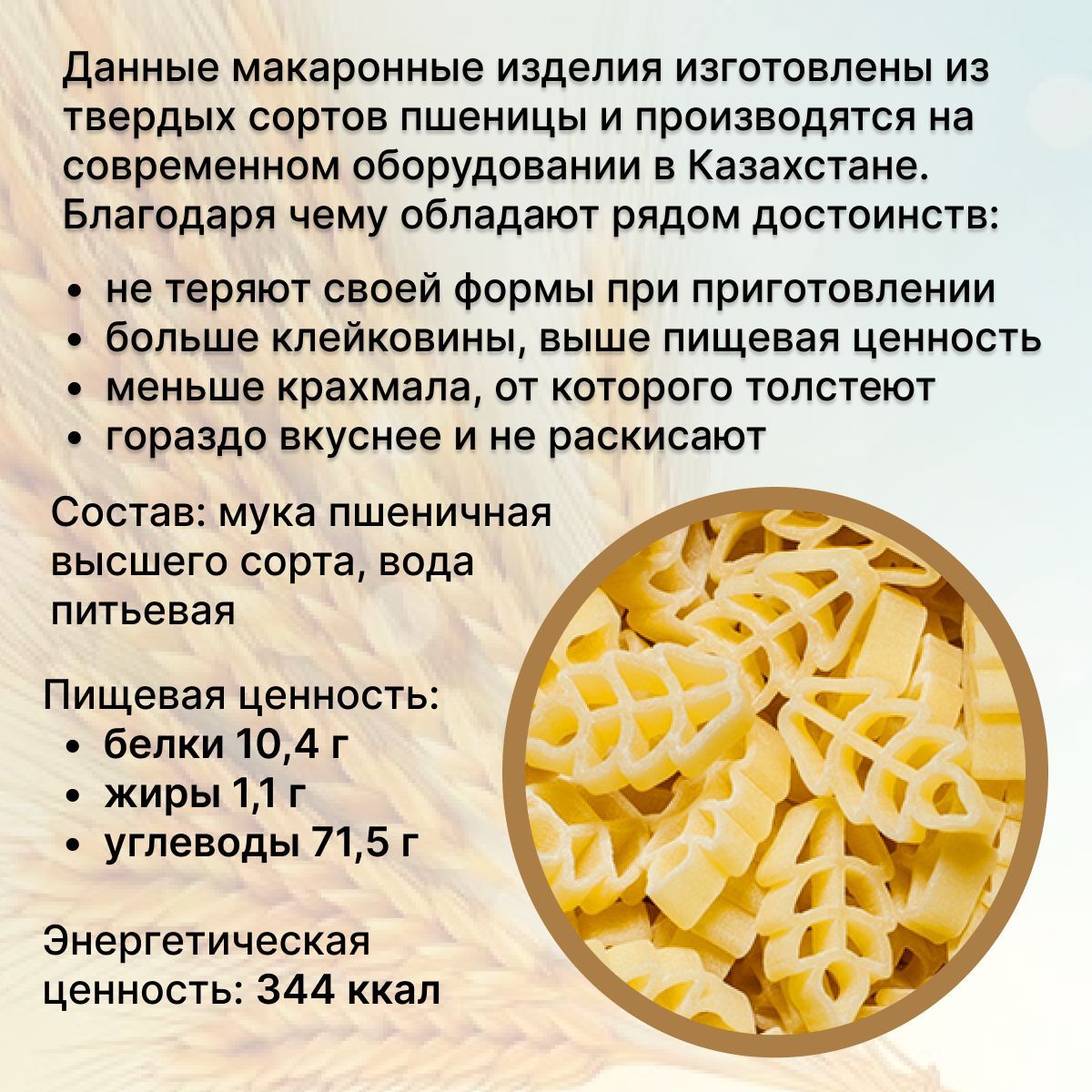 Описание: Макароны Мартин производятся в Республике Казахстан из муки высшего сорта. Для производства этих макаронных изделий выбраны специальные твердые сорта пшеницы, богатые полезными углеводами, благодаря которым человек быстро заряжается энергией и восстанавливает силы. Макароны, сделанные из пшеницы твёрдых сортов, обеспечивают поступление так называемых медленных углеводов.Благодаря этому, они не теряют своей формы при приготовлении. Это свойство особенно ценят любители пасты и других блюд из макарон, а также те, кто выбирает сбалансированное здоровое питание без ограничений.
