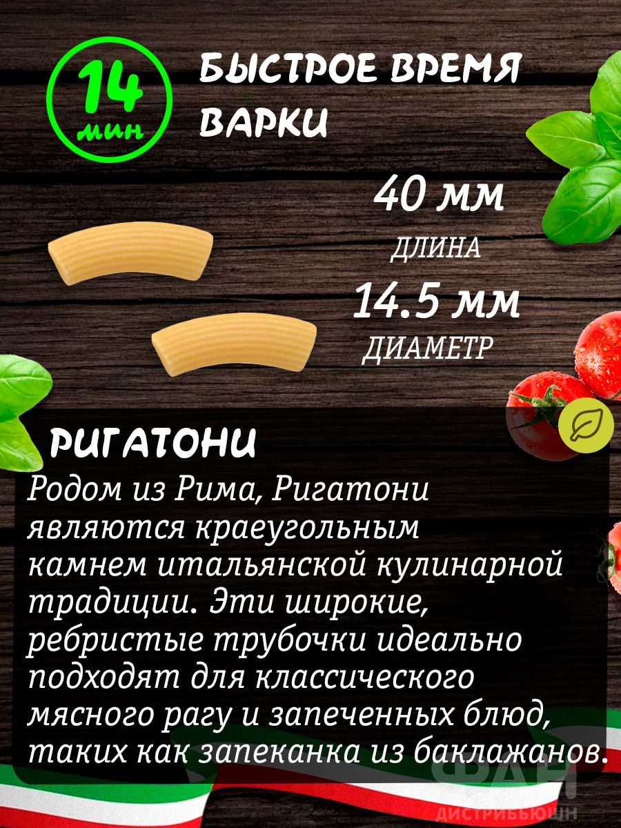 Описание: Итальянские рифленые макароны в форме трубочек РИГАТОНИ 500 гр из твёрдых сортов пшеницы пользуются большой популярностью сегодня. Макаронные изделия трубочки из пшеничной муки высшего сорта являются высоко белковым и веган продуктом, не содержат в составе гмо, глутамат, ароматизаторы, красители. Ребристые макарошки для фаршировки без яиц и молока в составе отлично подходят для детей, кето диеты дюкана для похудения и полезного сбалансированного питания. Длинные маквроны подходят для приготовления популярных блюд, среди которых: макароны по-флотски, mac and cheese с сыром, вок с грибами морепродуктами (креветки мидии моллюски) рыбой курицей, лапша со сливками в сливочном томатном сырном и сметанном соусе. Помимо этого, макарны перья также подходят для различных детских супов и бульонов. Фигурные макороны перышки не развариваются во время варки, не слипаются, сохраняют степень готовности альденте. Итальянская паста актуальна на любой повод: романтический вкусный обед и ужин, на праздничный стол, в День Рождения, 8 марта, Новый Год, 23 февраля. Макаронные изделия RUMMO из Италии очень разнообразны по форме и составу. Среди них есть мелкие и крупные макароны, подходящие для известных блюд китайской японской корейской вьетнамской кухни, среди которых острый том ям, фо бо, макен чиз, лазанья. В ассортименте присутствуют также безглютеновые продукты без глютена из кукурузной и рисовой муки, цельнозерновая гречневая лопша для лагмана, бобовая диетическая диабетическая паста из нута полбы и красной чечевицы. Есть маленькие и большие ракушки, картофельные клецки ньокки, гнезда, всевозможные спагетти, листы лазаньи, вермишель, широкая яичная дапша, звездочки и зернышки семечки ризони орзо по 400 гр 500гр 1000 гр 3 кг. Рекомендуем обязательно попробовать наши хиты фетучини, фузилли, лингвини и тальятелле. Все макароны бакалеи имеют большой срок хранения. На все ассорти товаров действуют приятные скидки. *Может содержать следы сои и горчицы.