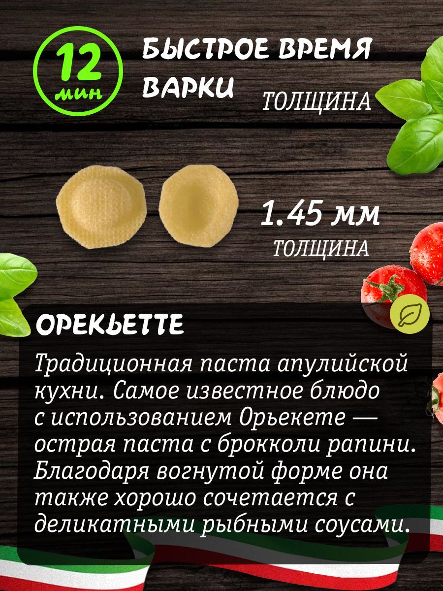 Описание: Итальянские плоские макароны в форме круглых пластинок ОРЕКЬЕТТЕ 500 гр из твёрдых сортов пшеницы пользуются большой популярностью сегодня. Макаронные изделия из пшеничной муки высшего сорта являются высоко белковым и веган продуктом, не содержат в составе гмо, глутамат, ароматизаторы, красители. Выпуклые макарошки без яиц и молока в составе отлично подходят для детей, кето диеты дюкана для похудения и полезного сбалансированного питания. Маквроны идеальны для приготовления популярных блюд, среди которых: макароны по-флотски, mac and cheese с сыром, вок с грибами морепродуктами (креветки мидии моллюски) рыбой курицей, лапша со сливками в сливочном томатном сырном и сметанном соусе. Помимо этого, макарны используются для различных детских супов с вермишелькой и бульонов. Фигурные макороны не развариваются во время варки, не слипаются, сохраняют степень готовности альденте. Итальянская паста актуальна на любой повод: романтический вкусный обед и ужин, на праздничный стол, в День Рождения, 8 марта, Новый Год, 23 февраля. Макаронные изделия RUMMO из Италии очень разнообразны по форме и составу. Среди них есть мелкие и крупные макароны, подходящие для известных блюд китайской японской корейской вьетнамской кухни, среди которых острый том ям, фо бо, макен чиз, лазанья. В ассортименте присутствуют также безглютеновые продукты без глютена из кукурузной и рисовой муки, цельнозерновая гречневая лопша для лагмана, бобовая диетическая диабетическая паста из нута полбы и красной чечевицы. Есть маленькие и большие ракушки, картофельные клецки ньокки, гнезда, всевозможные спагетти, листы лазаньи, вермишель, широкая яичная дапша, звездочки и зернышки семечки ризони орзо по 400 гр 500гр 1000гр 1 кг 3 кг. Рекомендуем обязательно попробовать наши хиты фетучини, фузилли, лингвини и тальятелле. Все макароны бакалеи имеют большой срок хранения. На все ассорти товаров действуют приятные скидки. *Может содержать следы сои и горчицы.