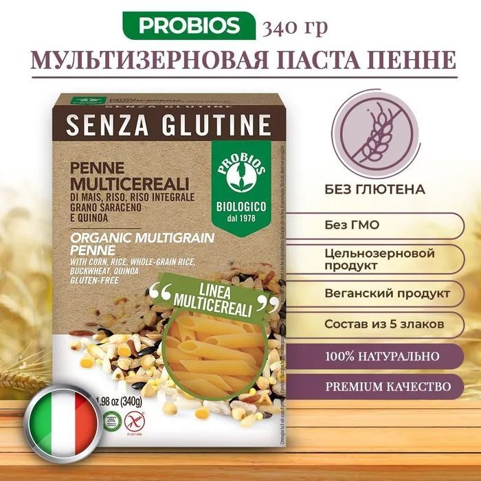 Описание: Откройте для себя уникальный вкус мультизерновых Penne от Probios, идеальной пасты для тех, кто следует безглютеновой диете или просто стремится добавить разнообразие в свои повседневные приемы пищи.