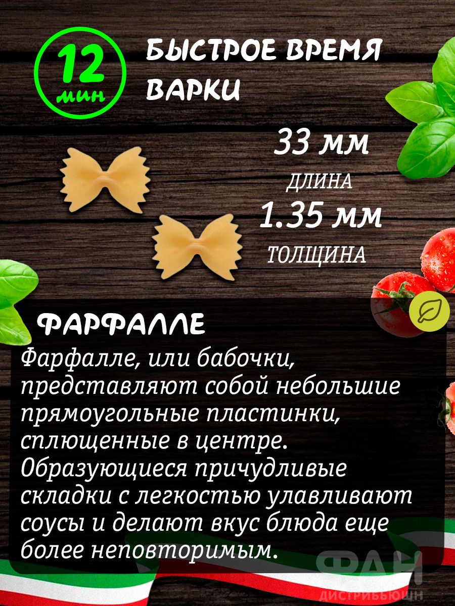 Описание: Итальянские макароны в форме бабочек ФАРФАЛЛЕ 1000 гр из твёрдых сортов пшеницы пользуются большой популярностью сегодня. Макаронные изделия бабочки из пшеничной муки высшего сорта являются высоко белковым и веган продуктом, не содержат в составе гмо, глутамат, ароматизаторы, красители. Макарошки спиральки без яиц и молока в составе отлично подходят для детей, кето диеты дюкана для похудения и полезного сбалансированного питания. Маквроны в форме бантика подходят для приготовления популярных блюд, среди которых: макароны по-флотски, mac and cheese с сыром, вок с грибами морепродуктами (креветки мидии моллюски) рыбой курицей, лапша со сливками в сливочном томатном сырном и сметанном соусе. Помимо этого, макарны бантики подходят для различных детских супов с вермишелькой и бульонов. Фигурные макороны не развариваются во время варки, не слипаются, сохраняют степень готовности альденте. Итальянская паста актуальна на любой повод: романтический вкусный обед и ужин, на праздничный стол, в День Рождения, 8 марта, Новый Год, 23 февраля. Макаронные изделия RUMMO из Италии очень разнообразны по форме и составу. Среди них есть мелкие и крупные макароны, подходящие для известных блюд китайской японской корейской вьетнамской кухни, среди которых острый том ям, фо бо, макен чиз, лазанья. В ассортименте присутствуют также безглютеновые продукты без глютена из кукурузной и рисовой муки, цельнозерновая гречневая лопша для лагмана, бобовая диетическая диабетическая паста из нута полбы и красной чечевицы. Есть маленькие и большие ракушки, картофельные клецки ньокки, гнезда, всевозможные спагетти, листы лазаньи, вермишель, широкая яичная дапша, звездочки и зернышки семечки ризони орзо по 400 гр 500гр 1 кг 3 кг. Рекомендуем обязательно попробовать наши хиты фетучини, фузилли, лингвини и тальятелле. Все макароны бакалеи имеют большой срок хранения. На все ассорти товаров действуют приятные скидки. *Может содержать следы сои и горчицы.
