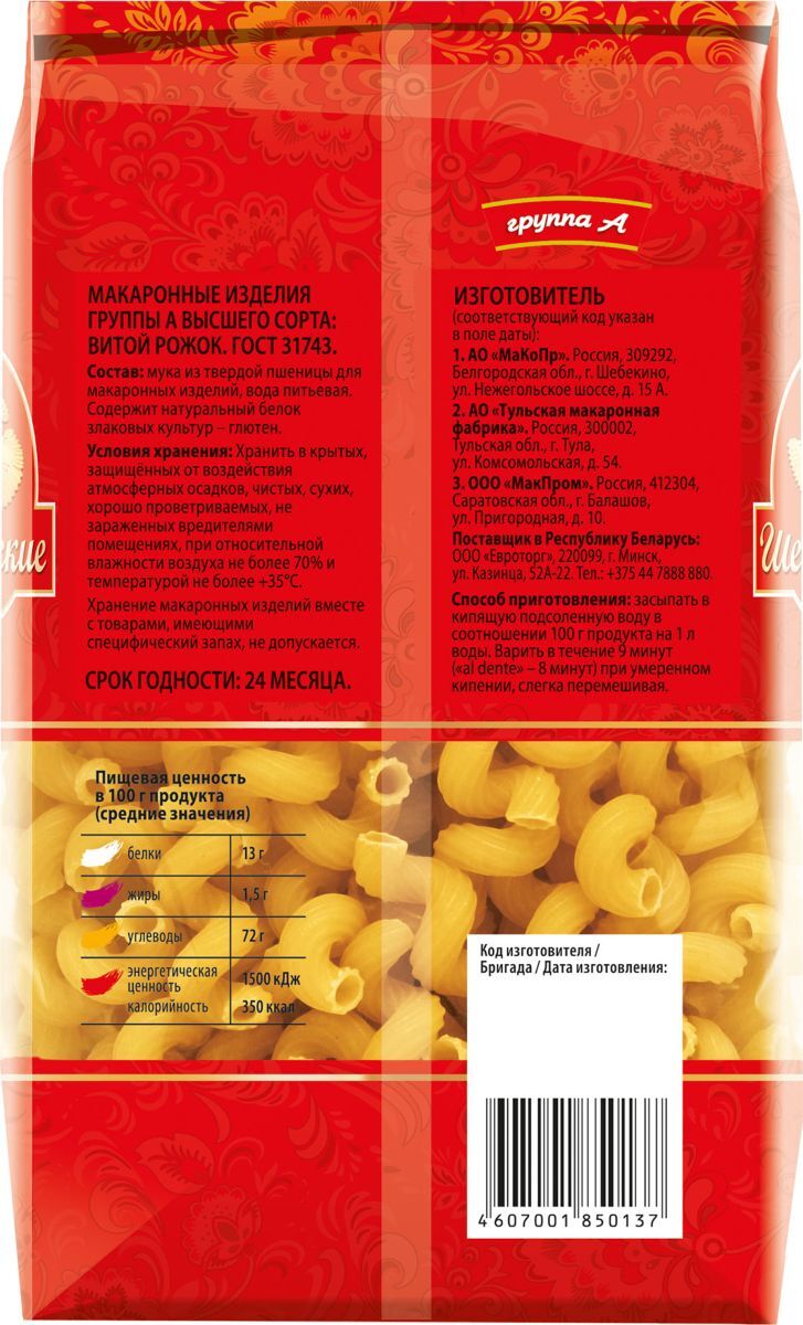 Описание: Макароны Шебекинские Витой рожок имеют форму скрученной узкой трубки, что делает их универсальным продуктом на кухне.