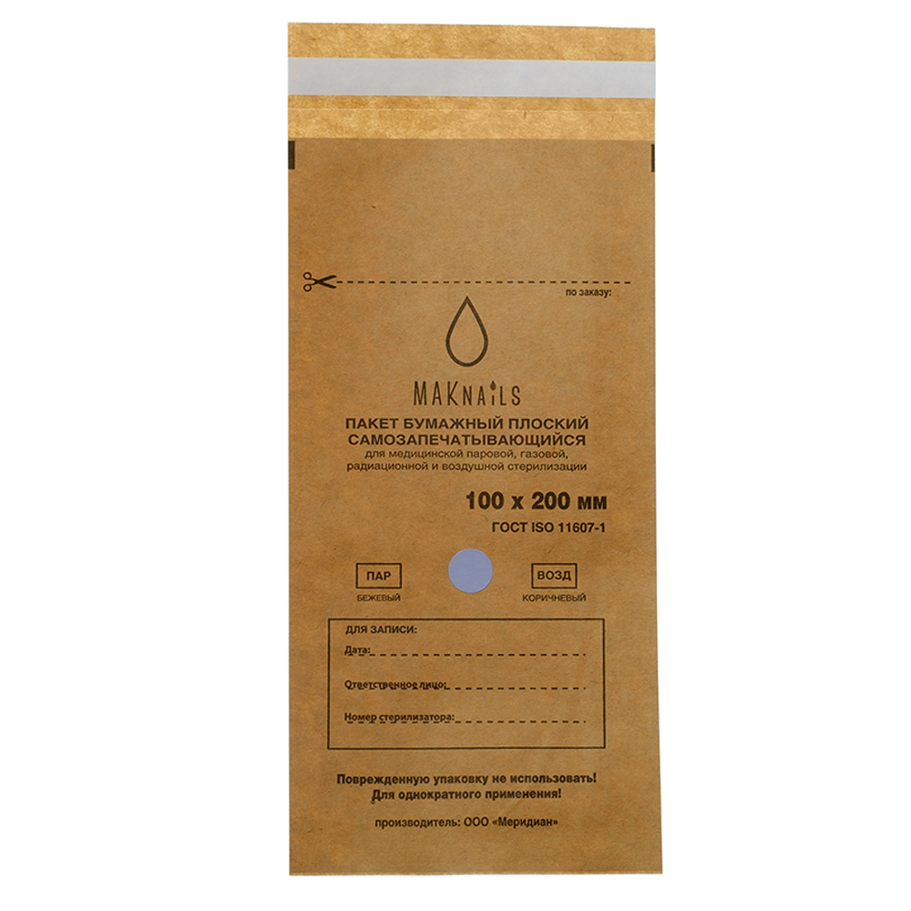 MAKnails упаковка соответствует требованиям предъявляемым  к упаковочным материалам В РФ ( ГОСТ ISO 11607-2011) , а так же требованиям европейского стандарта EN 868.Пакет бумажный является изделием однократного применения!!!