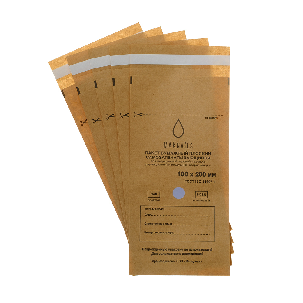 MAKnails, Крафт-пакеты для стерилизации инструментов, коричневые, 100х200 мм 100 шт.