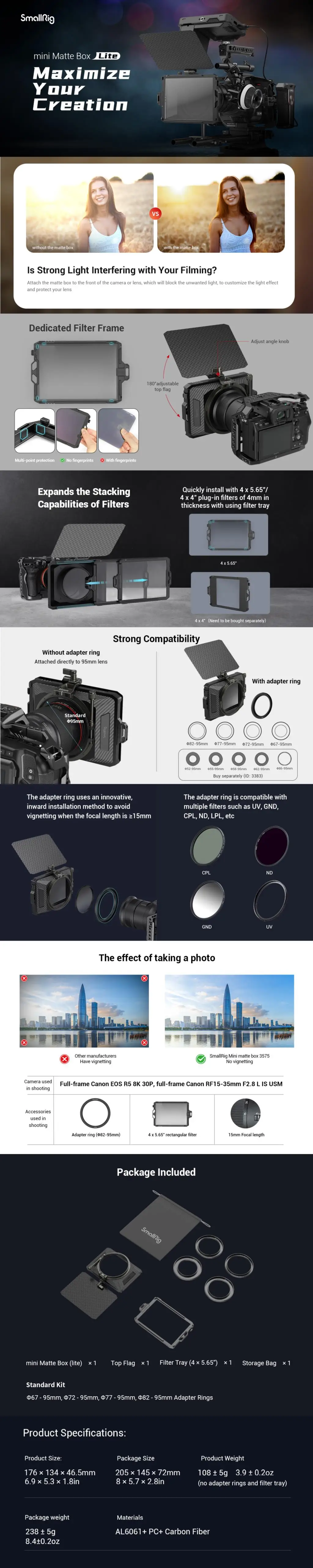 SmallRig Mini Matte Box Lite 3575 Предназначен для DSLRs и беззеркальных камер для предотвращения светильник солнца или других светильник от бликов и управления изображениями на экране. Его зажим соединитель работает с переходными кольцами различных размеров (Φ52-95мм; 5555-95мм; 5858-95мм; Φ62-95мм; Φ67-95мм; attached 72-95мм; 7777-95мм; directly 82-95мм непосредственно прикреплен к объективу; его переходное кольцо подходит для CPL, ND фильтра и других круговых фильтров до Φ92.5мм. С помощью фильтра лоток (ID: 3319/3320) может быстро установить с 4x5,65 "/4x4" вставные фильтры толщиной 4 мм. Легко хранить лоток для фильтров (ID: 3319/3320), который можно быстро установить на матовую коробку с помощью зажима NATO, поддерживает несколько подключаемых фильтров 4x5,65 "/4x4" толщиной 4 мм одновременно, защищает фильтры от случайных падений и предотвращает появление царапин и отпечатков пальцев при замене подключаемых фильтров. Регулируемый флаг из углеродного волокна блокирует светильник от солнца или сильный светильник, а также предотвращает внутренние отражения с его антибликовым дизайном.