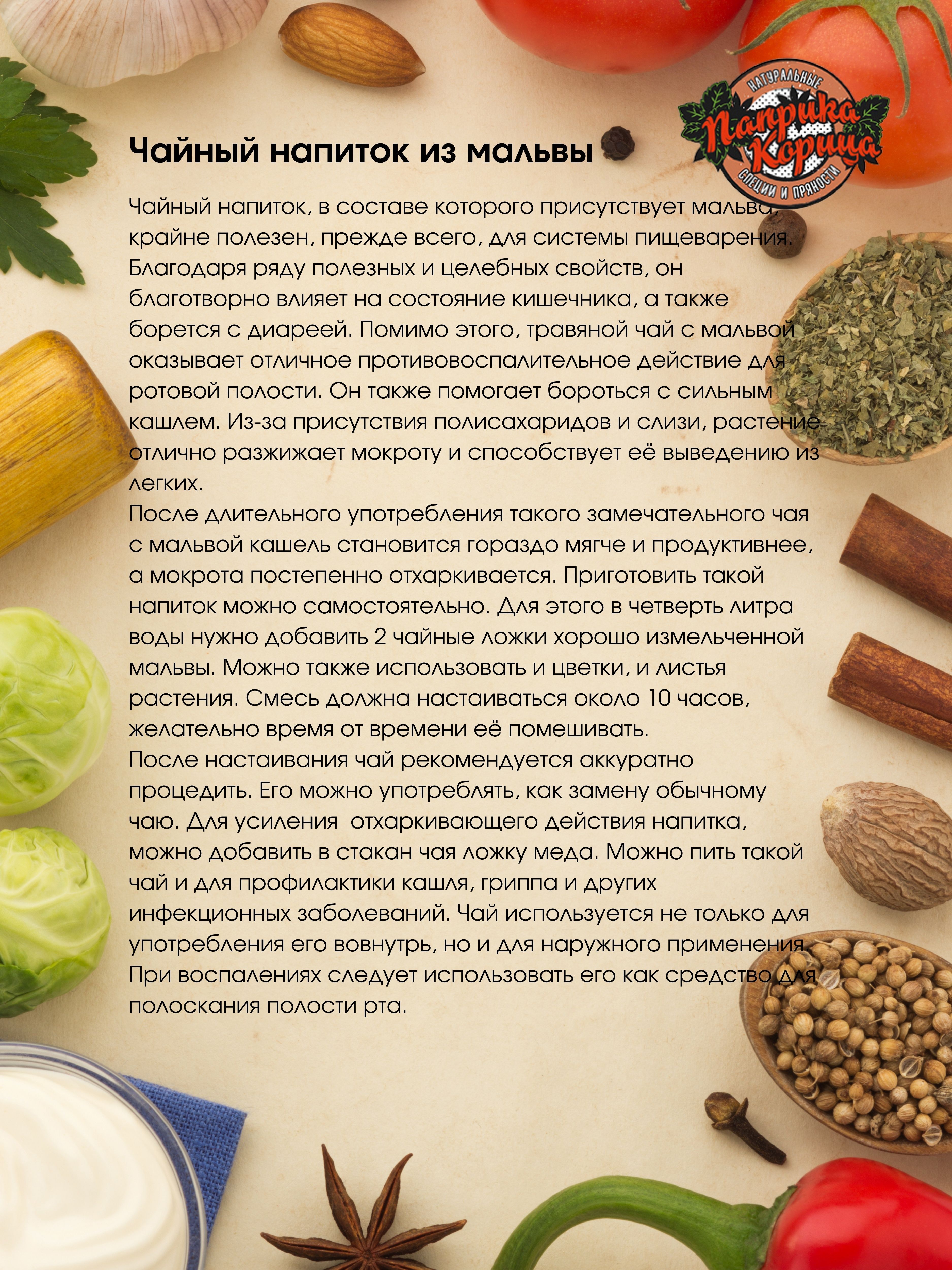 Описание: Мальва синяя цветки- травянистое целебное растение. В народной медицине цветки мальвы используют для лечения бронхита, блефарита, воспалений ЖКТ, заболевания мочевыводящих путей, а также проблем с печенью и селезенкой. Кроме того, растение обладает антиоксидантным эффектом - экстракт мальвы способен снижать скорость старения клеток. Мальва содержит витамины А,С и каротин. Способ приготовления: на 250 мл воды добавить 2 чайные ложки сухого продукта и настаивать около 10 часов, время от времени помешивая. Процеженный напиток является действенной профилактикой кашля, гриппа и других заболеваний. Растение надежно упаковано в коробку размером 20х40 см, которая помогает сохранить свежесть мальвы. Коробка с сушеными листьями защищена прочным транспортировочным коробом, что обеспечивает её сохранность при доставке. Продается в удобной фасовке 50 гр. в картонной коробке с маркировкой ИП "Медына М.Д."