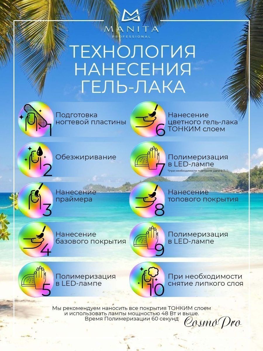 Описание: Гель лаки для маникюра Весна - Лето 2023 NEON - это 24 шикарных насыщенных оттенка!!! Простота использования и безопасность: не затекает за кутикулу, быстро сохнет, не полосит и не пузырится. Основные плюсы: гипоаллергенный; без неприятного запаха; легкое нанесение даже для начинающих nail мастеров; идеальная текстура; хорошая и удобная кисть; не конфликтует с базой и топом других марок; стойкий, носится 4 недели. А дизайн для ногтей с ними получается просто нереальным! Для просушки и полимеризации используется лампа UV / LED. Не высыхают на «открытом» воздухе. ВАЖНО! Каждый цвет очень пигментированный (плотный), и его нужно наносить максимально тонким слоем!!! (как первый, так и последующие) и каждый слой обязательно просушить. Комбинируйте, экспериментируйте, соберите свой набор гель лаков для ногтей! Профессиональная косметика для ногтей бренда MANITA PROFESSIONAL – это все для маникюра и педикюра высокого качества по приемлемой цене.