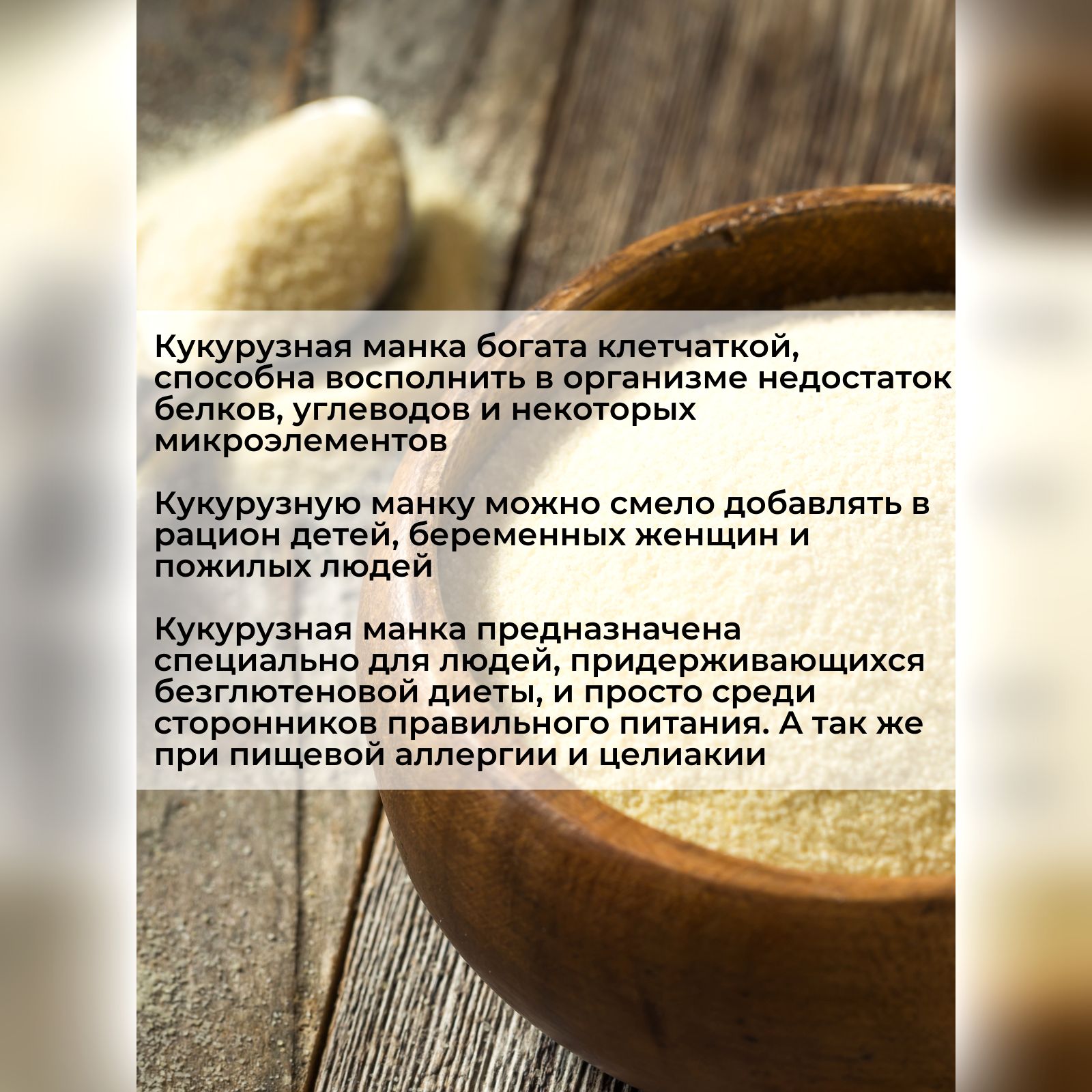 Кукурузная манка — это ценный и питательный продукт, богатый белками, крахмалом, витаминами и минеральными веществами. Витамины (А, группы В, С, Е, К и РР) делают кожу упругой, придают блеск волосам и укрепляют зубы. Также они улучшают работу мозга, повышают уровень гемоглобина в крови, нормализуют работу нервной системы.