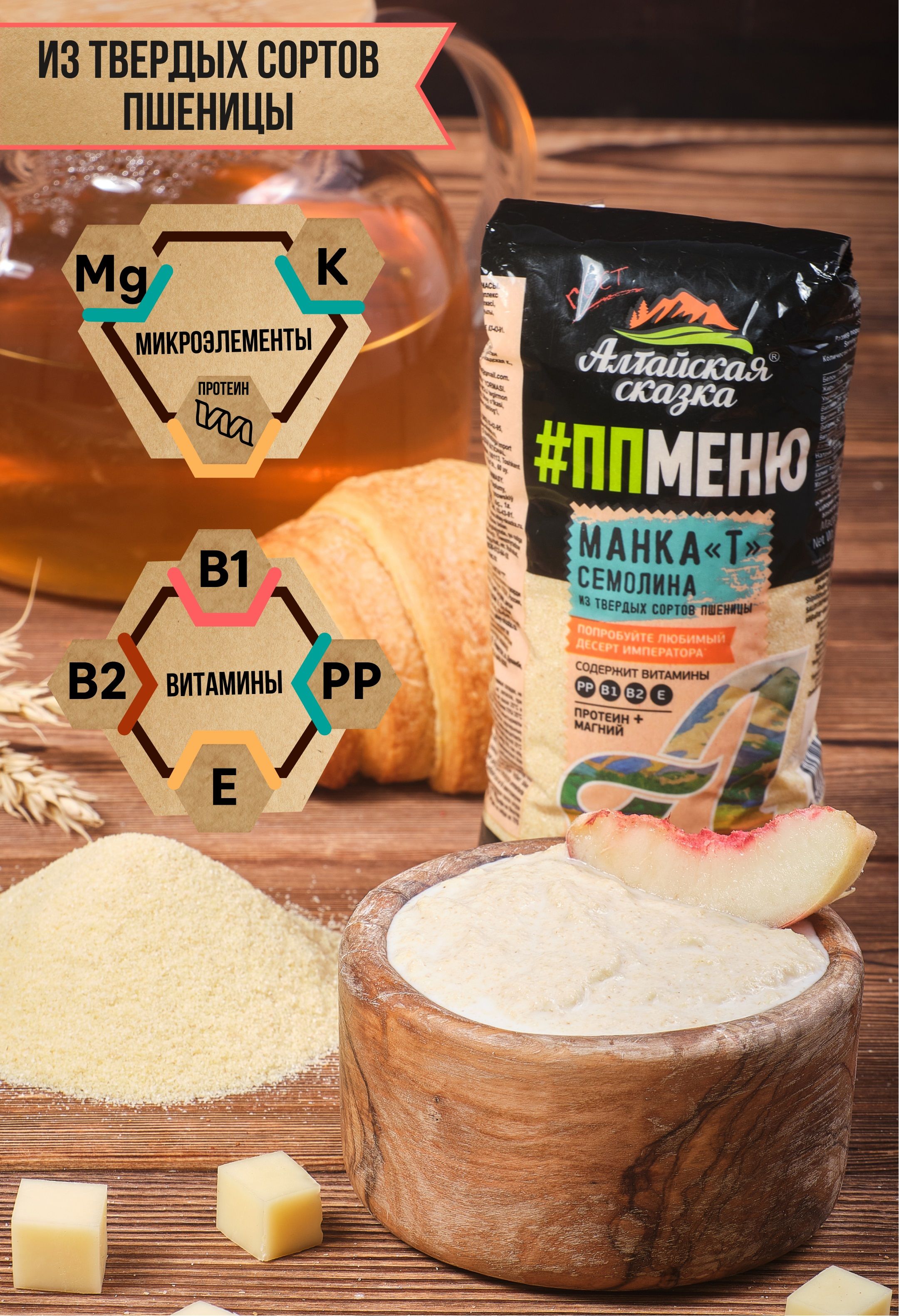 Является продуктом правильного питания. Манка из твердых сортов пшеницы идеальна для детей, спортсменов и людей, стремящихся к ЗОЖ. Полезная альтернатива обычной манки.