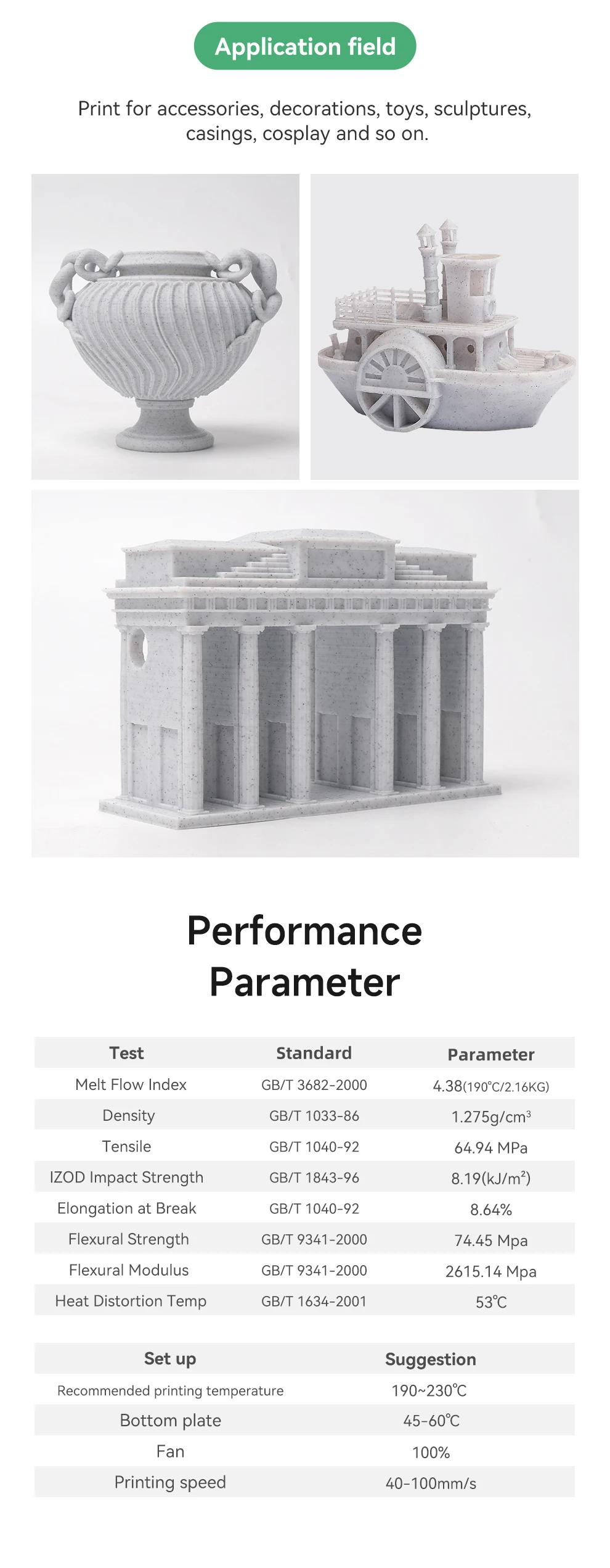 【Экологически чистый материал】 Мраморный PLA представляет собой смесь PLA и мраморных элементов. Нити eSUN изготовлены из первичных материалов, биоразлагаемые и экологически чистые, нетоксичные и со слабым запахом, без вреда для пользователя и окружающей среды. Идеально подходит для внутренней печати.