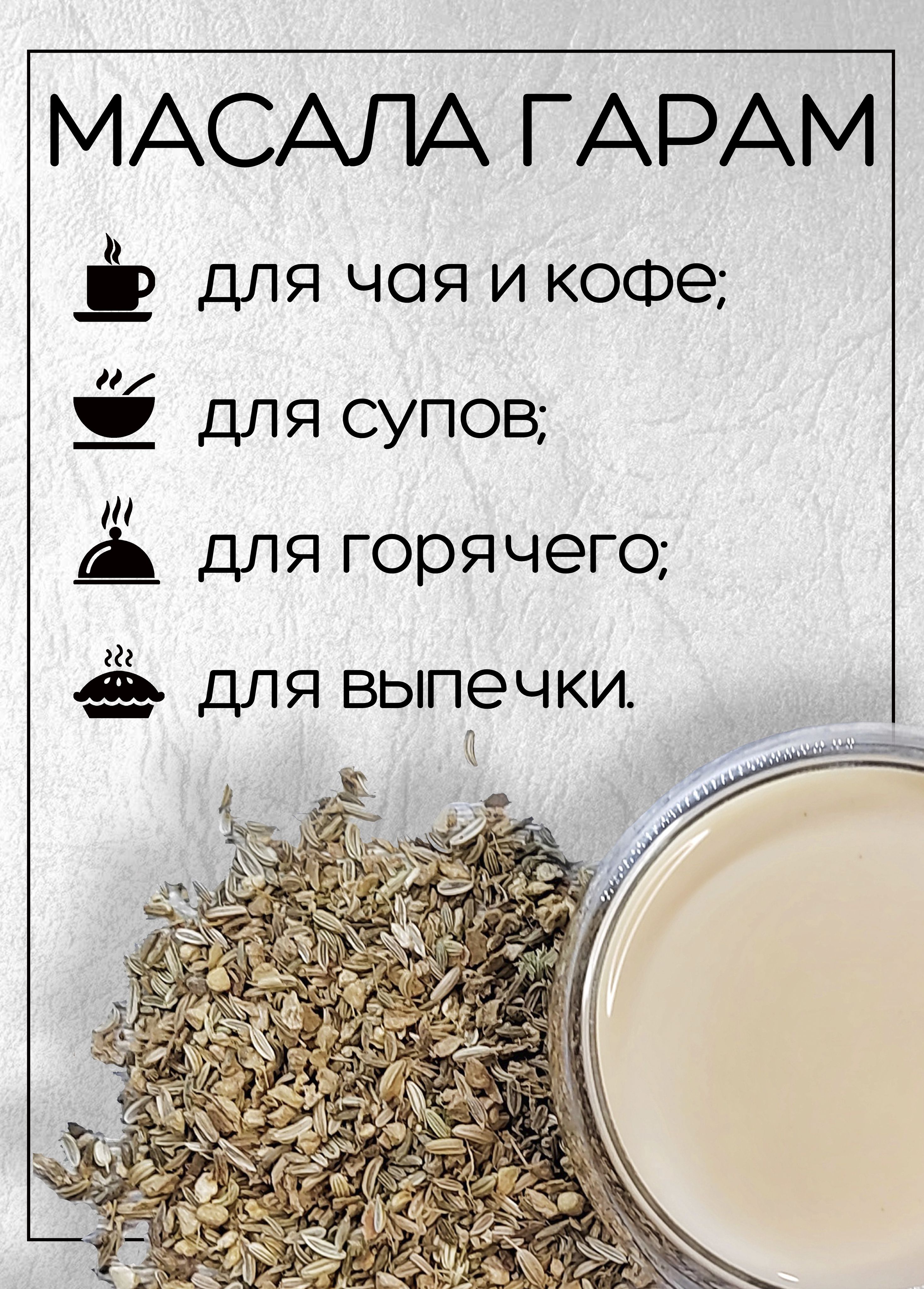 Описание: Масала: Гарам масала или "горячая смесь специй" - это традиционная смесь из Индии, которую добавляют в чай или кофе, а так же приправа подойдет идеально к кашам, выпечке, супам, овощным и мясным блюдам.