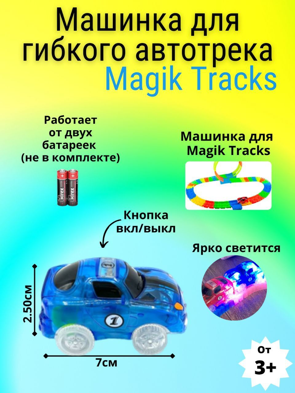 Описание: Magic Tracks— это большая круговая трасса, по которой ездят маленькие машинки со светящимися фарами. Машинка стремительно мчится вперед, огибая множество различных преград и резких поворотов. Ваш малыш сможет самостоятельно собирать треки, по которым будут ездить машинки, а все детали из набора состыкуются с другими треками серии Magic Tracks. Трасса искривляется в любом направлении. Соберите свою собственную трассу за считанные секунды. Детали светятся в темноте. Гоночные машинки оснащены яркими светодиодами. В комплекте 1 машинка, работает от 2-х батареек (в упаковке не идут). Трек легко сворачивается для хранения. Набор Magic Tracks сделан из безопасных материалов. Набор рассчитан на детей от 3-х лет и старше. Все детали набора сделаны из высококлассного прочного пластика, который увеличивает их срок службы.