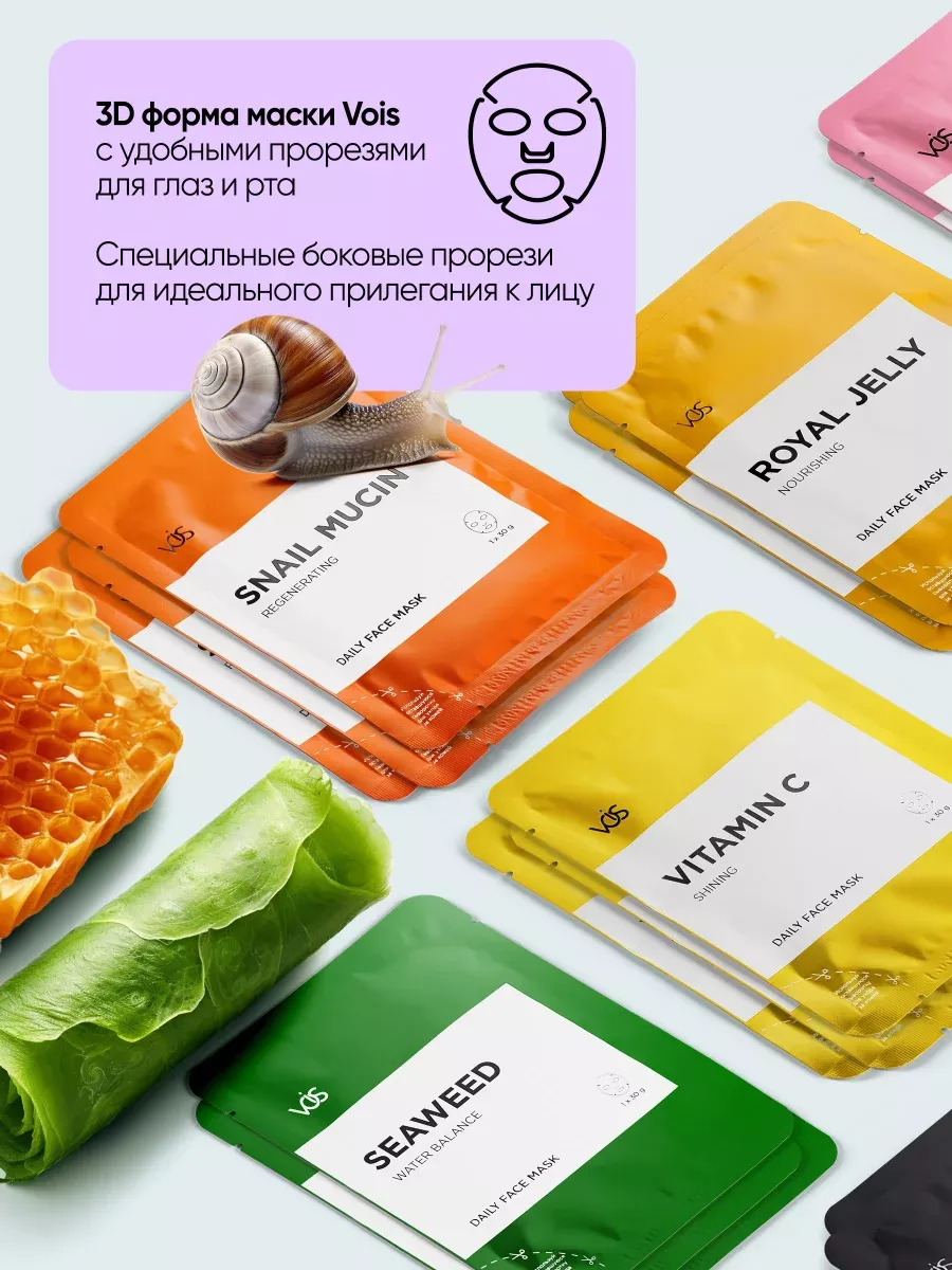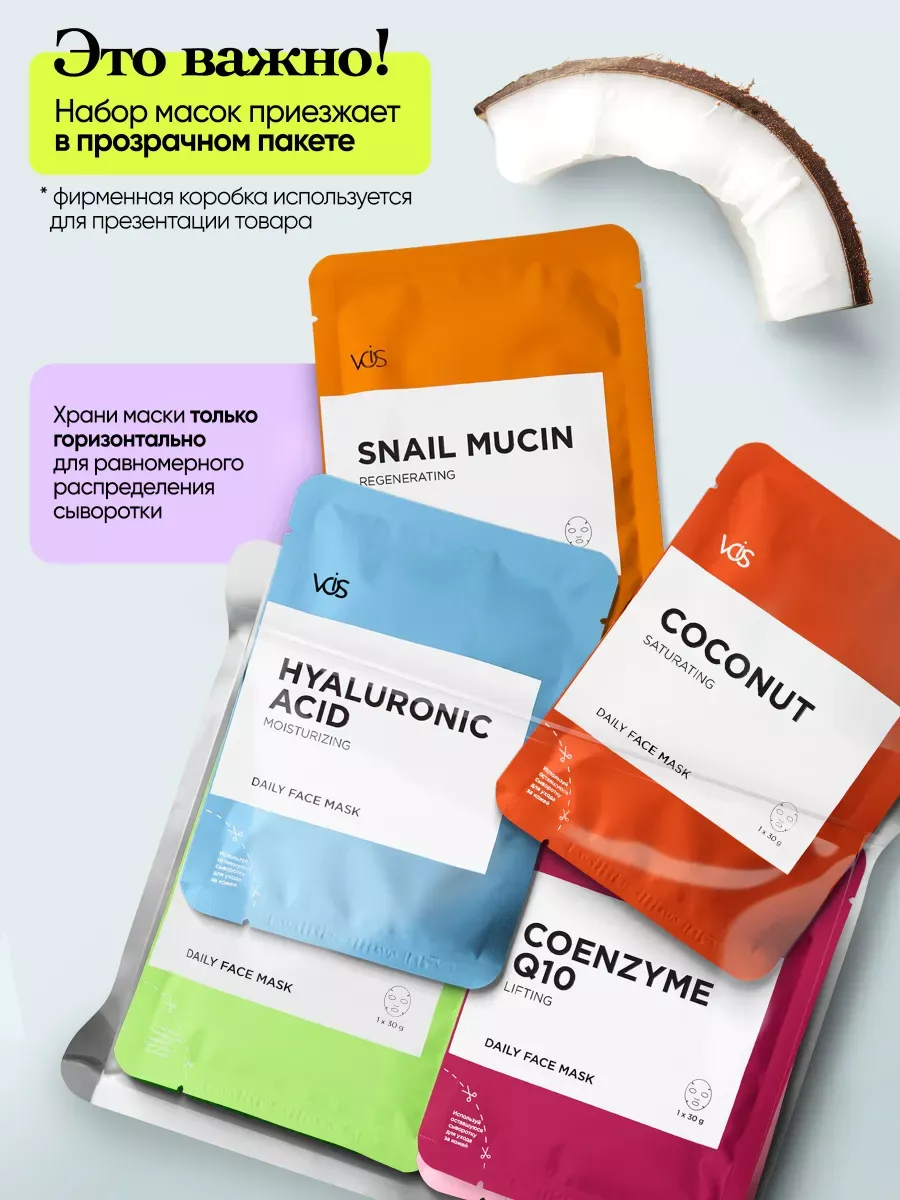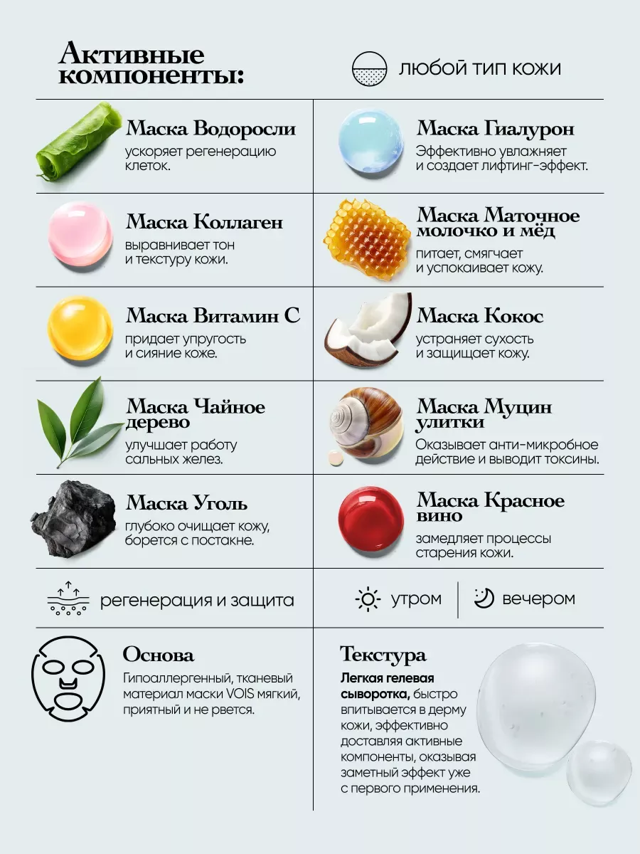 Артикул 92442613 Состав гиалуроновая кислота, коллаген, витамин С, муцин улитки; чайное дерево, маточное молоко и мёд, морские водоросли и гиалуроновая кислота; экстракт красного вина и черники, уголь, вулканический пепел и соя, кокос и цидония