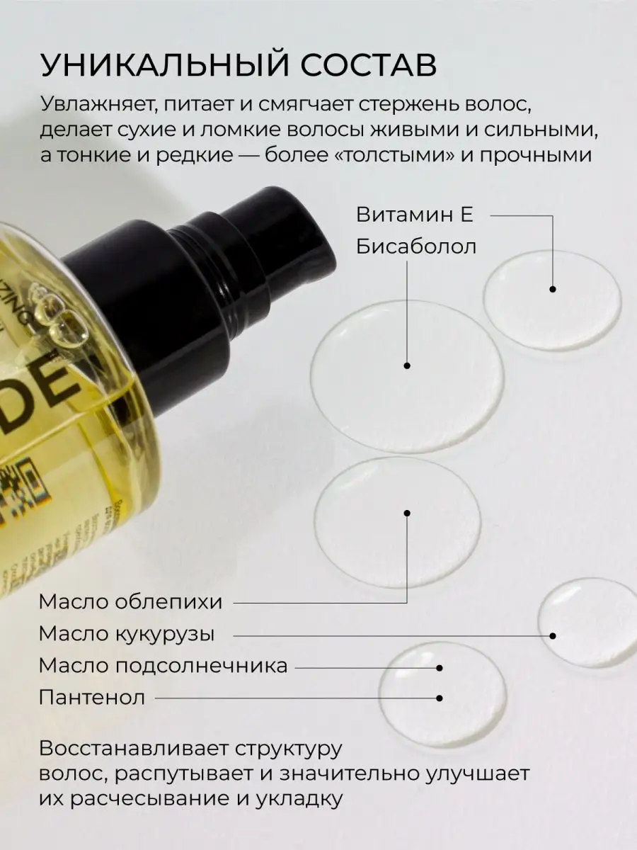 Артикул 137801893 Состав Cyclopentasiloxane; Dimethiconol; Isopropyl Myristate; Phenyl Trimethicone; Perfume; Zea Mays (Corn) Oil; Helianthus Annuus (Sunflower) Seed Oil; Hippophae Rhamnoides (Sea Buckthorn) Fruit Oil; Panthenol; Bisabolol; Tocopherol; Lecithin; Ascorbyl Palmitate