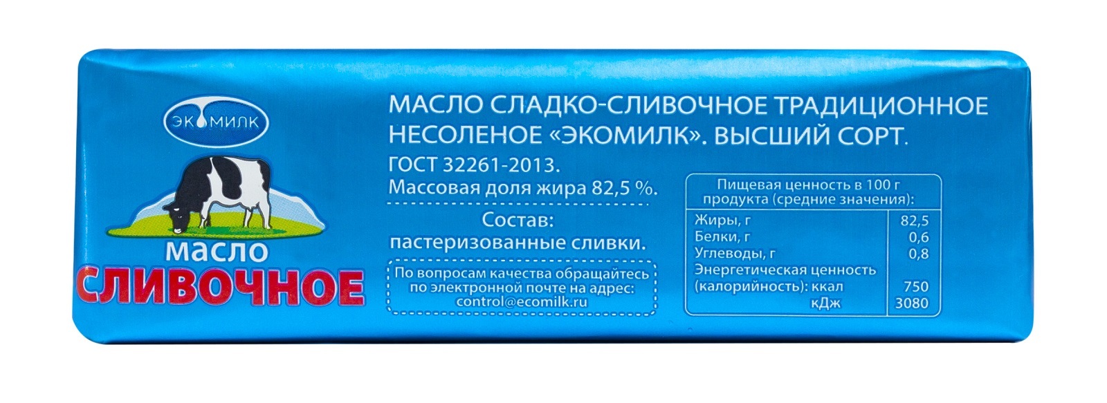 Масло сладко-сливочное традиционное несоленое «Экомилк» Высший сорт 82,5%, 380 г