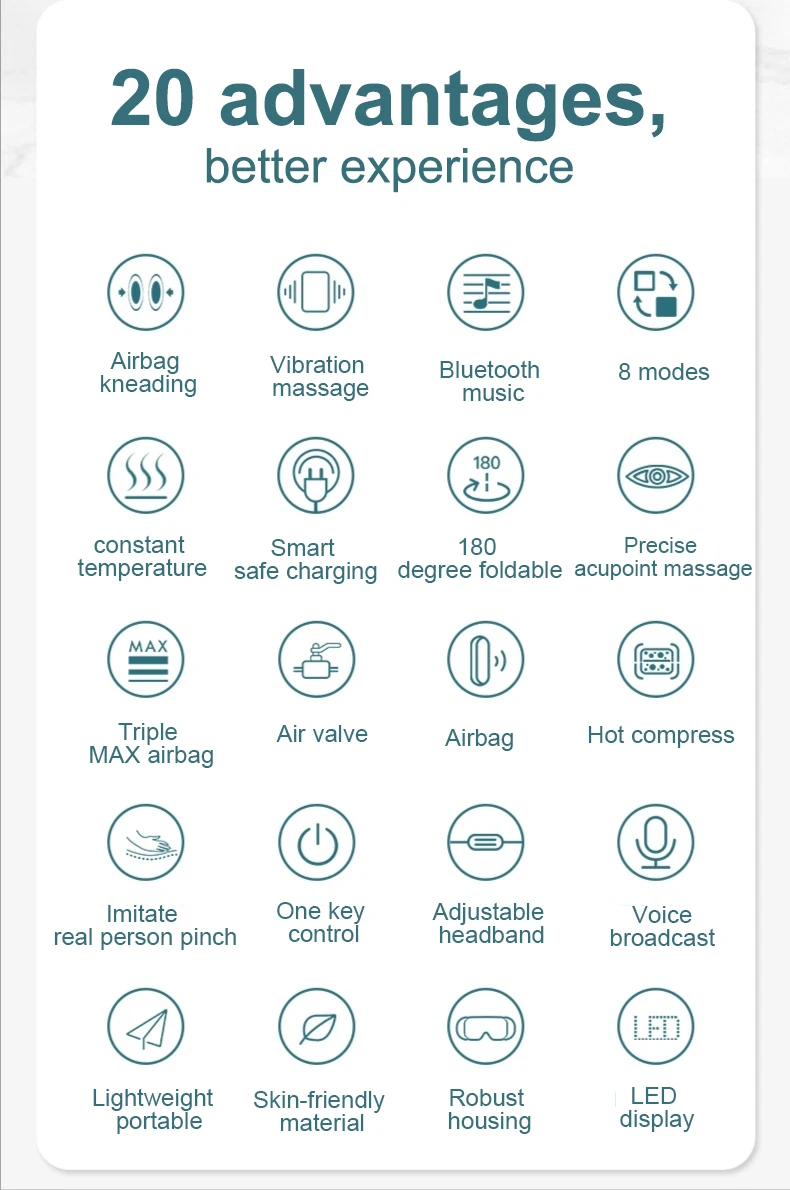 Массаж давления воздуха, горячий компресс с постоянной температурой, вибрационный массаж, музыка Bluetooth, длительный срок службы батареи, портативное хранение