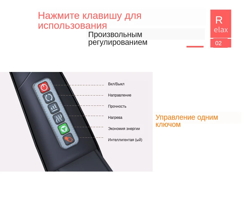 ① Кнопка ВКЛ/ВЫКЛ для запуска и закрытия массажа ② Кнопка направления, чтобы переключить направление массажных головок ③ Кнопка скорости для изменения скорости головок массажа ④ Кнопка нагрева, чтобы открыть или закрыть нагрев ⑤ Энергосберегающая кнопка для экономии электроэнергии Smart Кнопка Smart mode автоматически изменяет направление и прочность в цикле. Всего, 3 разных умных режима