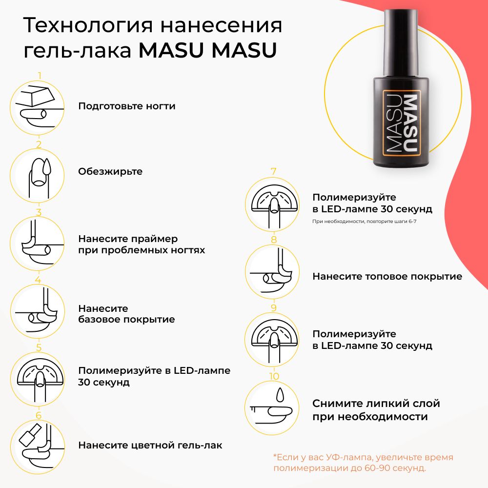 Для идеального результата рекомендуем наносить гель-лак тонким слоем и сушить в течении 1-ой минуты в LED лампе и 2-х минут в UV лампе мощностью не менее 48 ВтВ составе нет токсичных веществ:формальдегида, толуола, дибутилфталата, камфоры, ксилола, этил тозиламидаТекстовое описание изображенияЕще больше интересный идей для маникюра в нашем магазинеПереходите в наш магазин и найдите свой идеальный оттенок гель-лака.