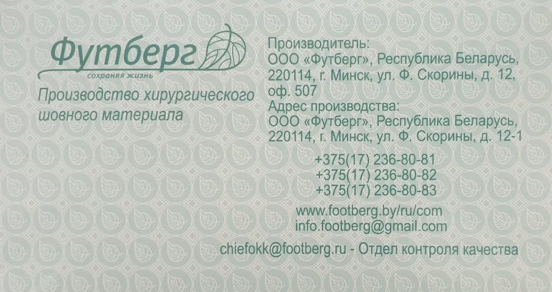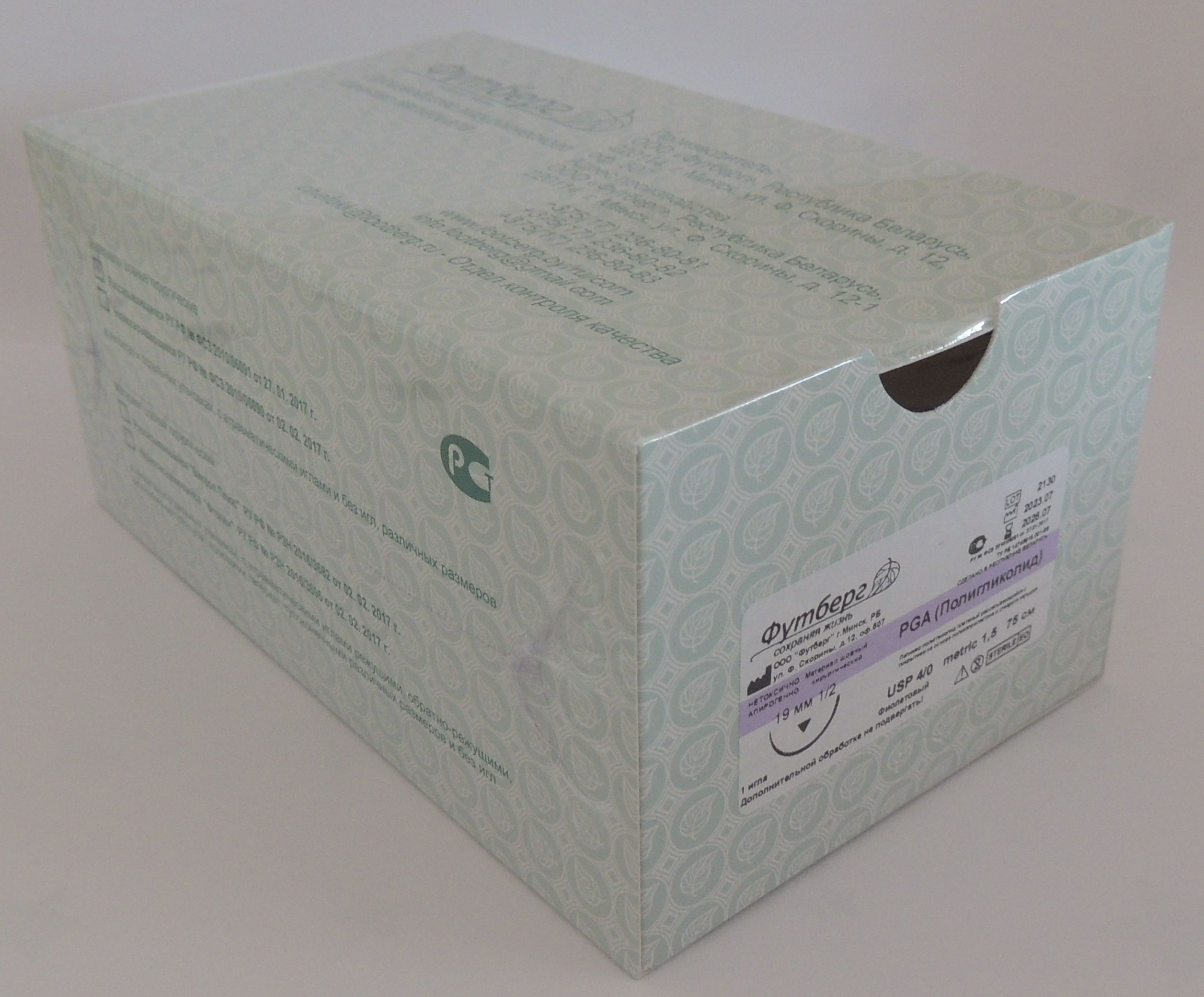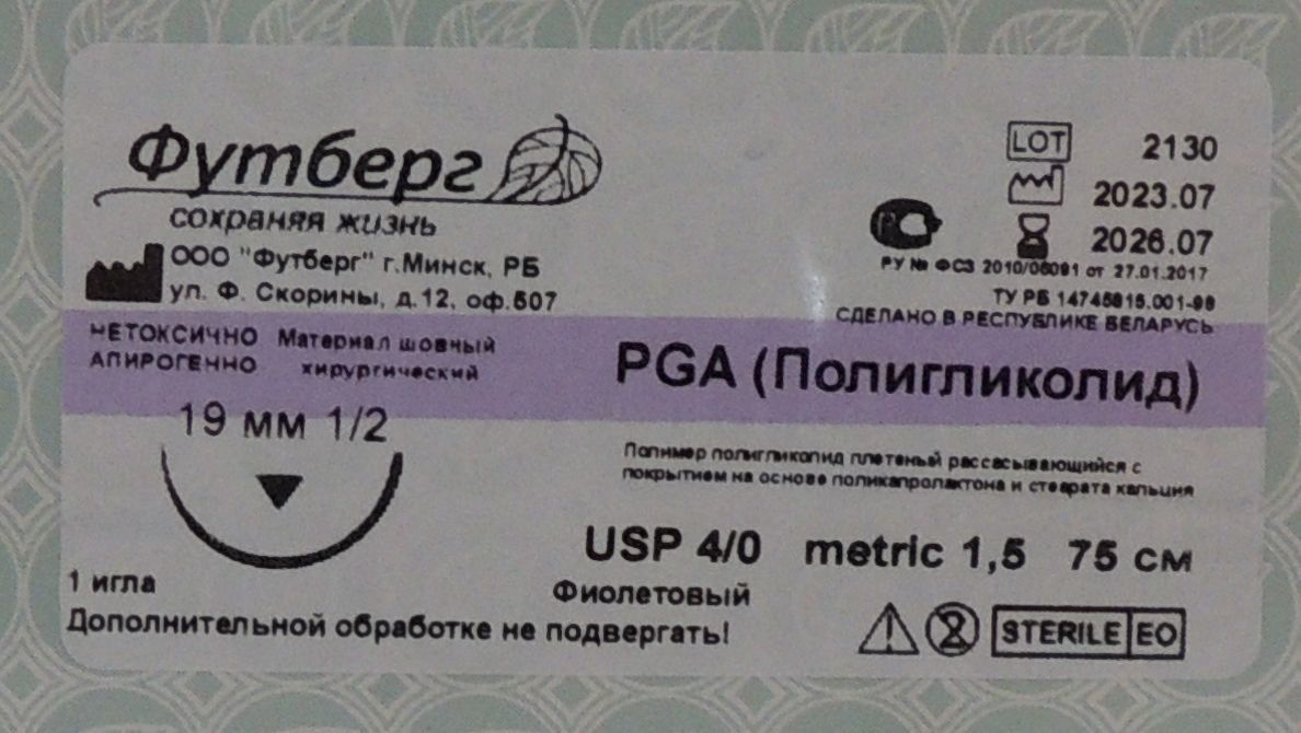 Материал шовный хирургический (Футберг) ПГА PGA (Полигликолид), фиолетовый, Metric 1,5 USP 4/0, 75 см 1 игла режущая, 19 мм, изгиб 1/2, 12 шт.