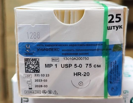 Материал шовный хирургический УНИФЛЕКС мононить поливинилиденфторидная USP 5/0 (МР 1), 75см., с иглой КОЛЮЩАЯ HR-20, синяя (25шт./уп.)*