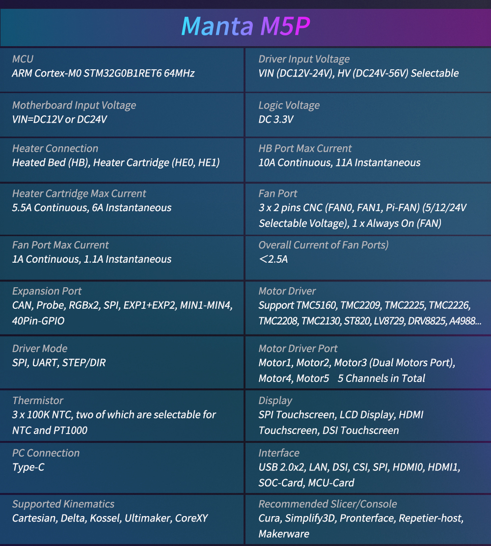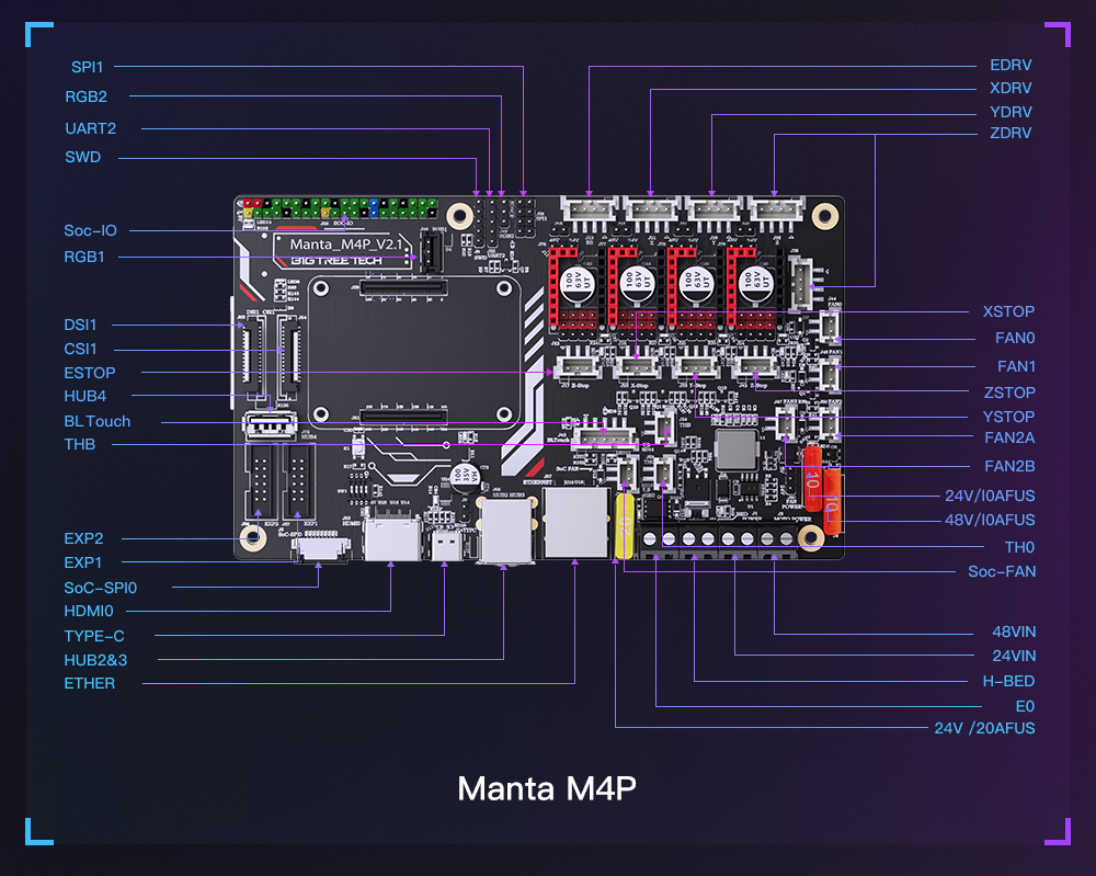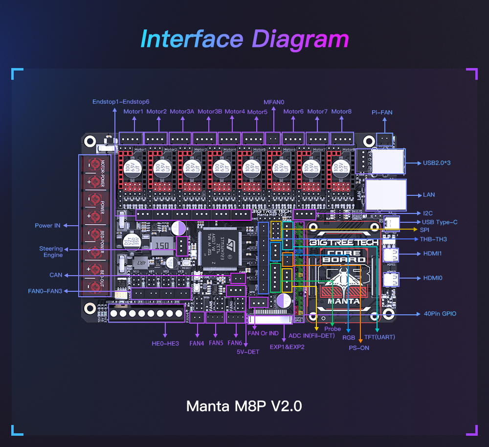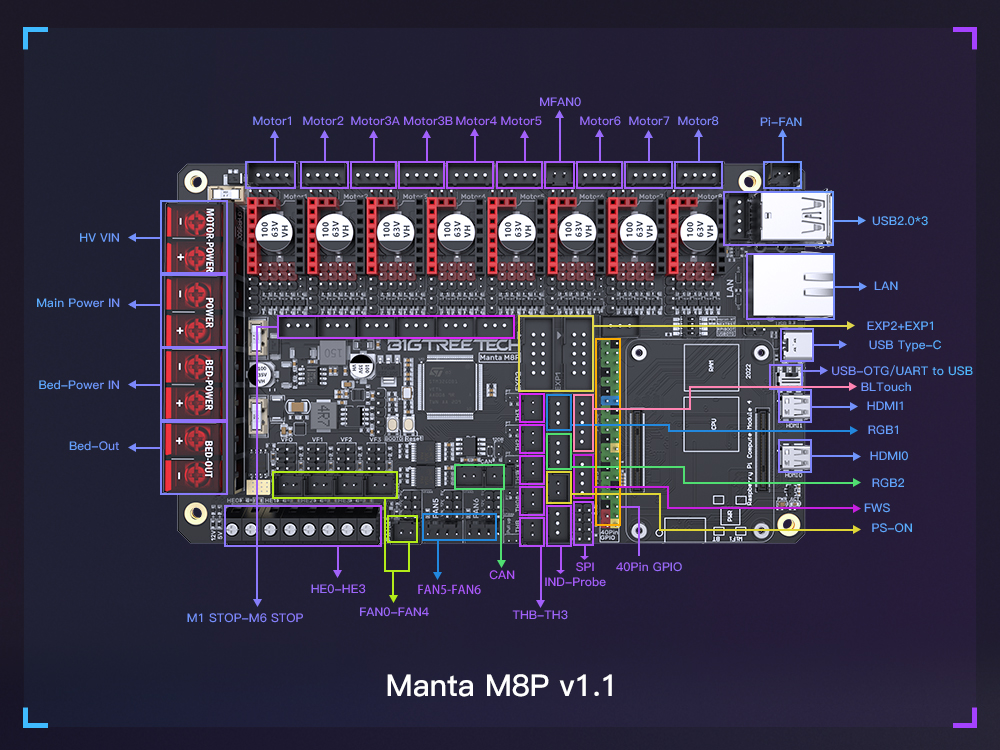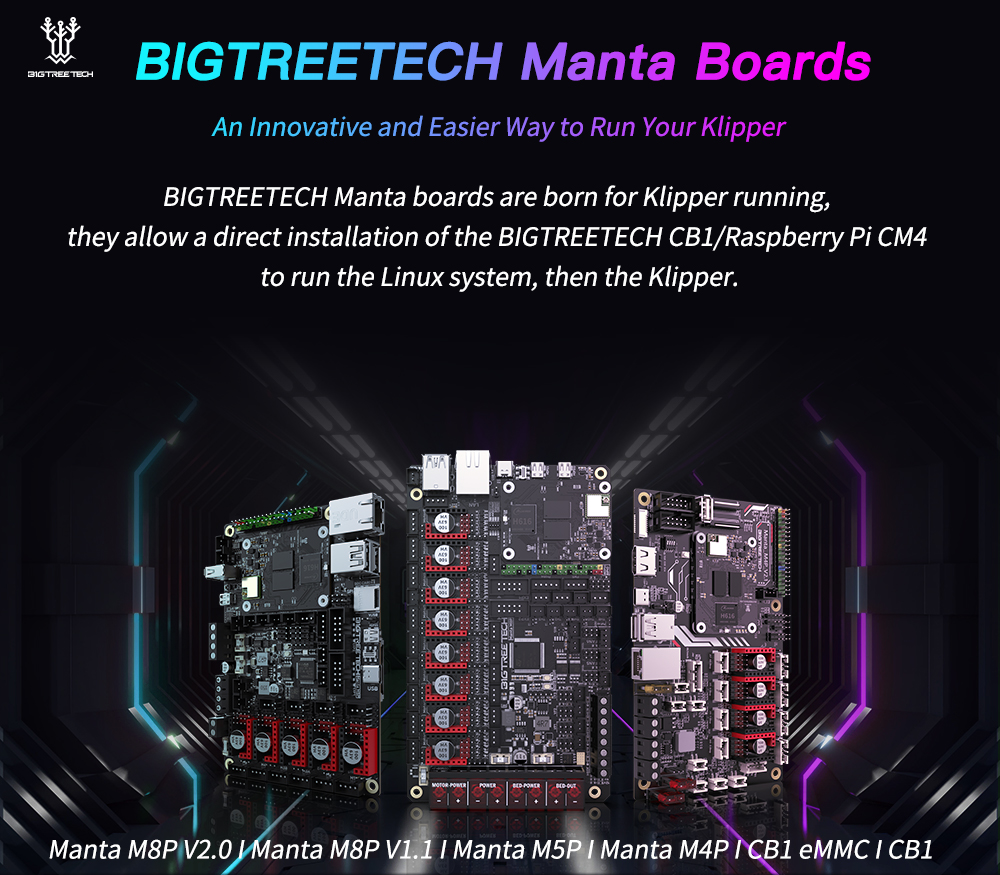 BIGTREETECH MANTA M8P-это материнская плата 32-битного принтера, разработанная командой 3D-печати Shenzhen Big Tree Technology Co., Ltd. для прошивки Klipper. Вы можете просто подключить основную плату для запуска прошивки Klipper, что значительно упрощает соединение между материнской платой и Raspberry Pi и экономит много места. Кроме того, разъем BTB предназначен для установки CM4 или других решений для решения текущей дорогостоящей проблемы CM4.