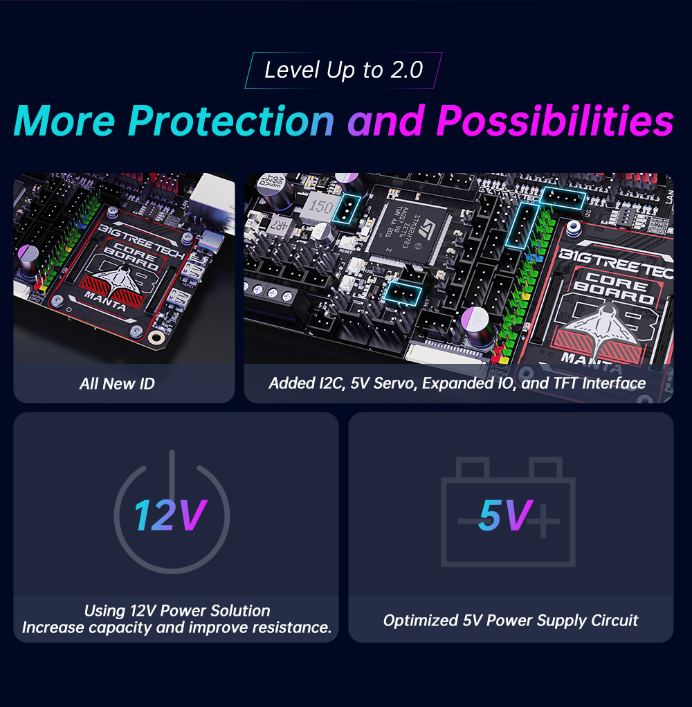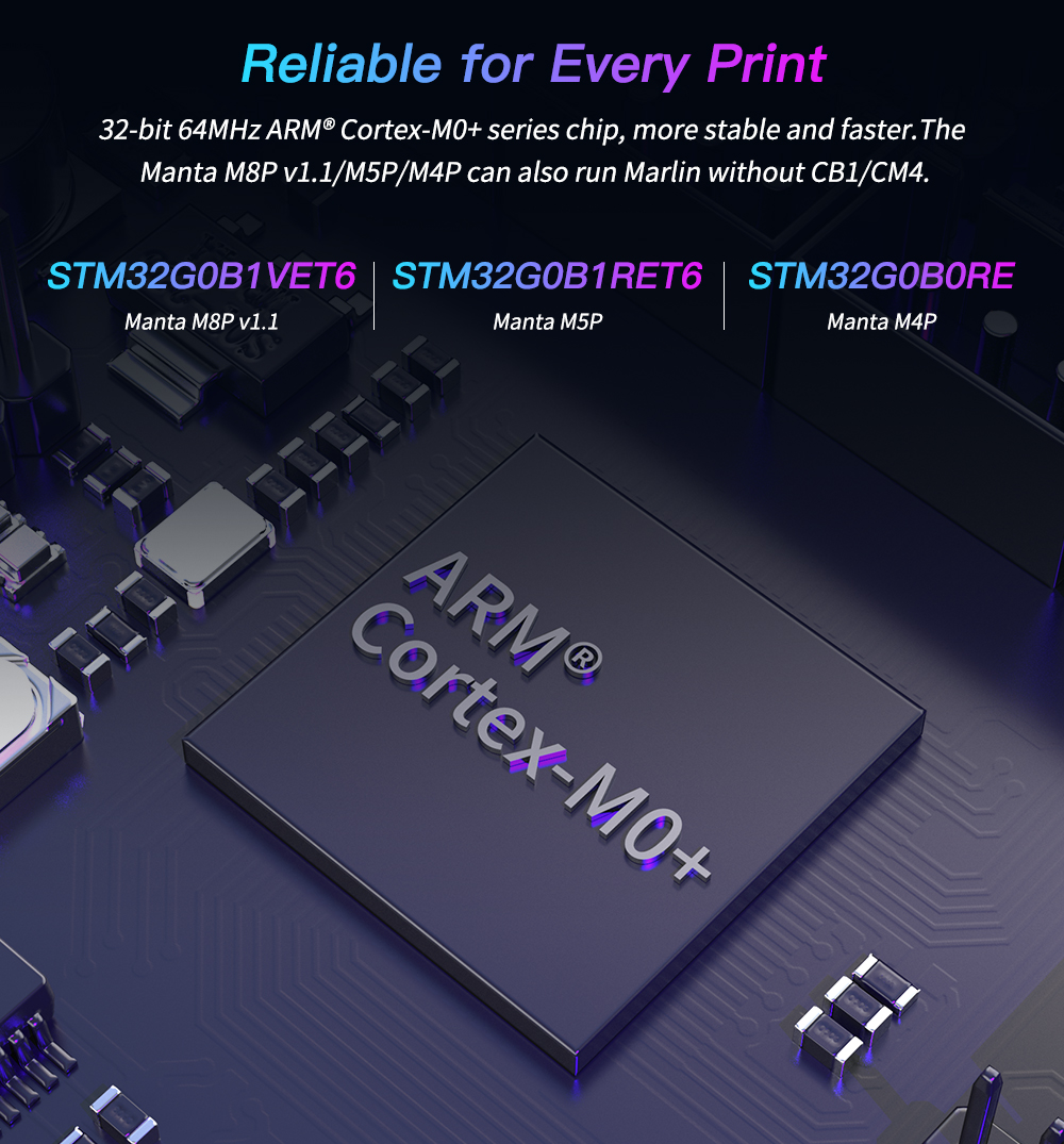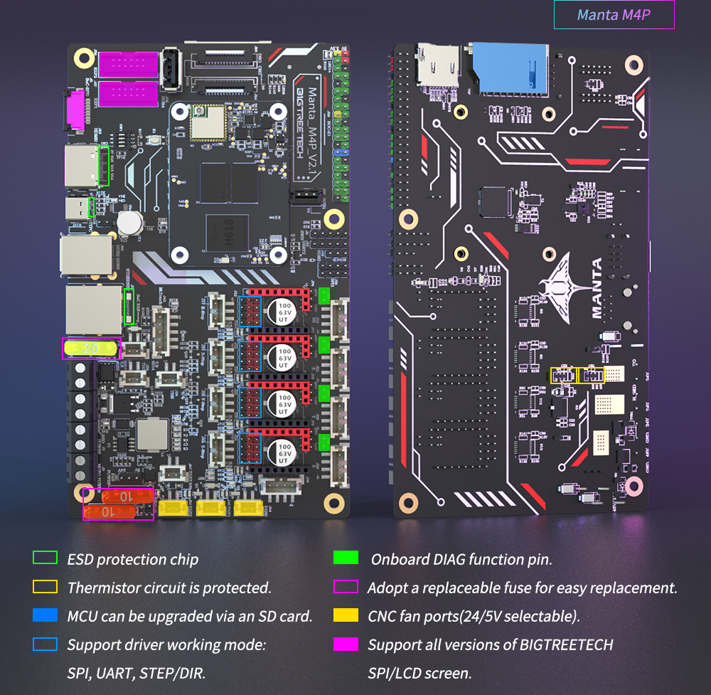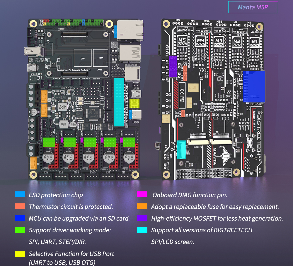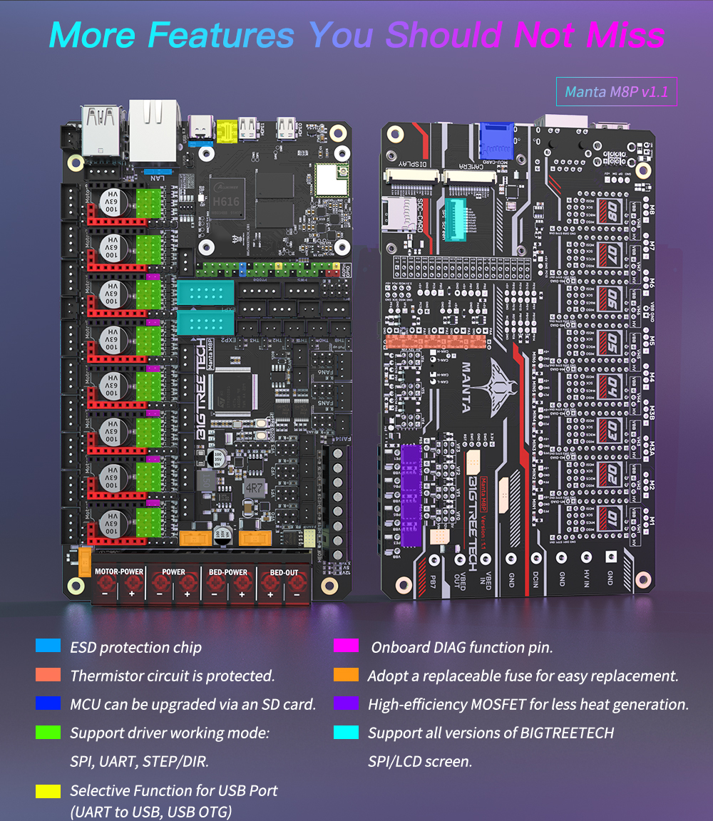 BIGTREETECH MANTA M8P-это материнская плата 32-битного принтера, разработанная командой 3D-печати Shenzhen Big Tree Technology Co., Ltd. для прошивки Klipper. Вы можете просто подключить основную плату для запуска прошивки Klipper, что значительно упрощает соединение между материнской платой и Raspberry Pi и экономит много места. Кроме того, разъем BTB предназначен для установки CM4 или других решений для решения текущей дорогостоящей проблемы CM4.