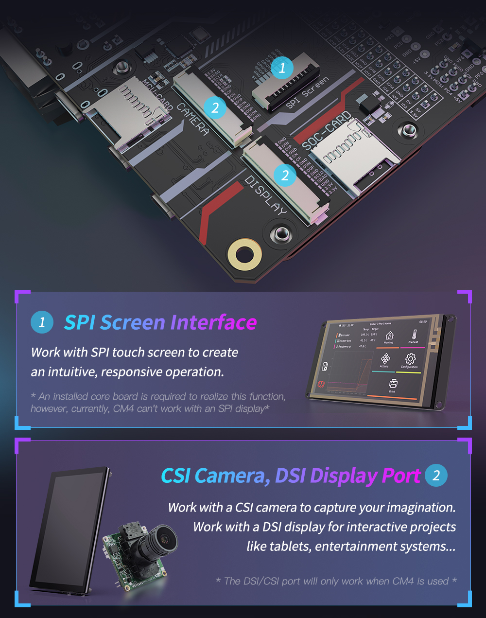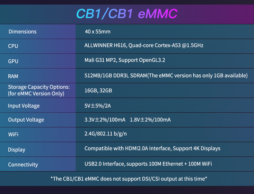 1. CB1 не может быть подключен к экрану PI TFT. Порт DSI/CSI будет работать только при использовании CM4.