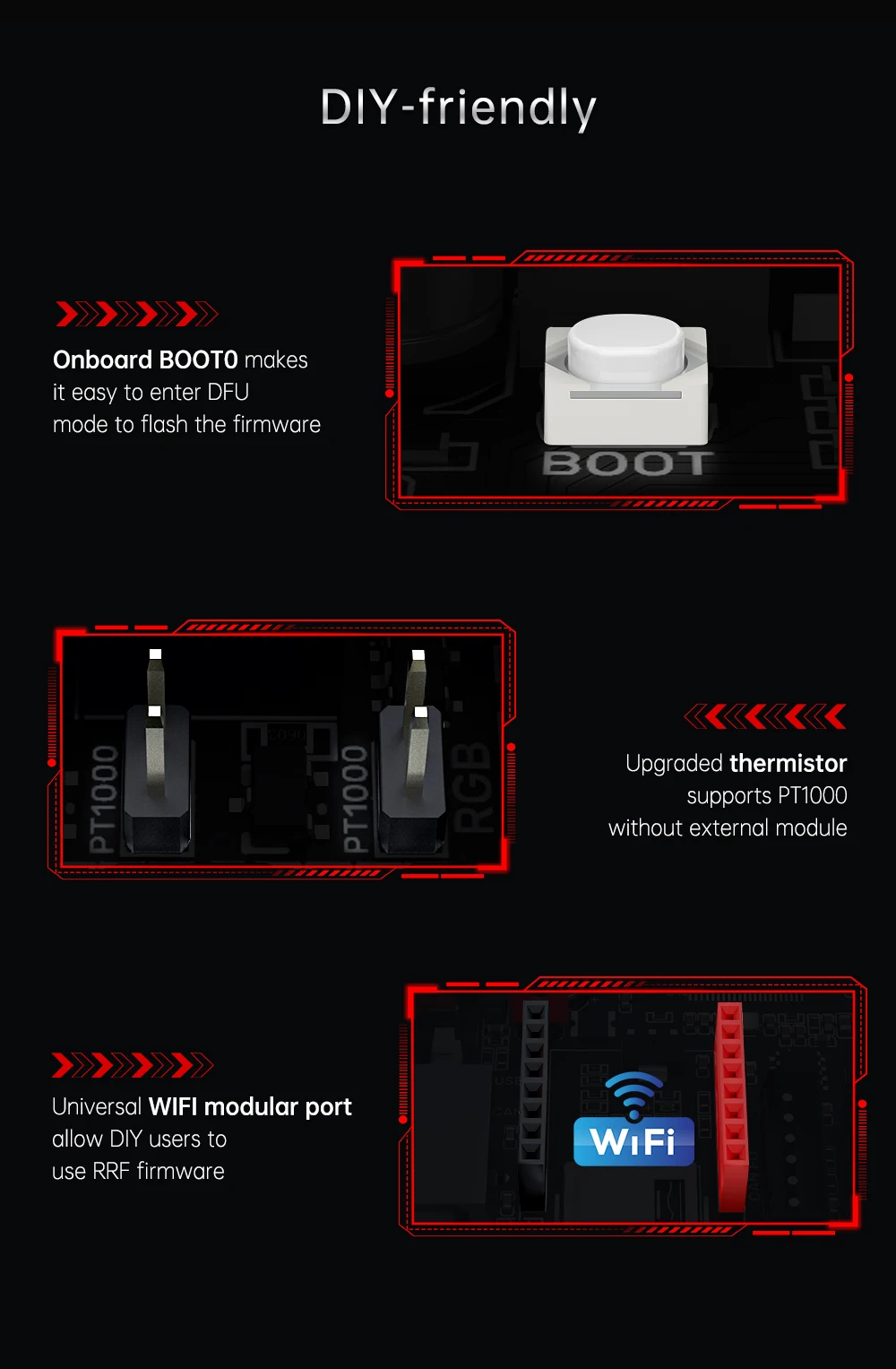 5. Встроенный Рабочий режим SPI и рабочий режим UART, управляемый TMC; встроенные контакты DIAG, которые можно использовать, отсоединяя колпачки перемычек.